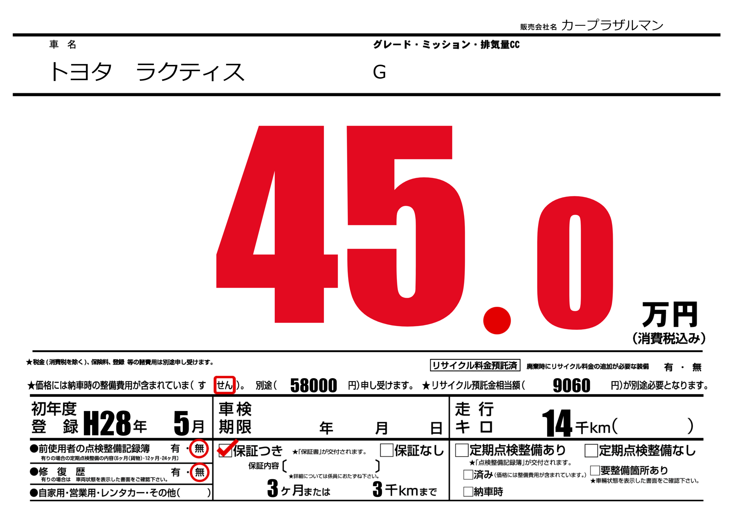 | 車名 | トヨタ ラクティス | グレード ミッション 排気量 |