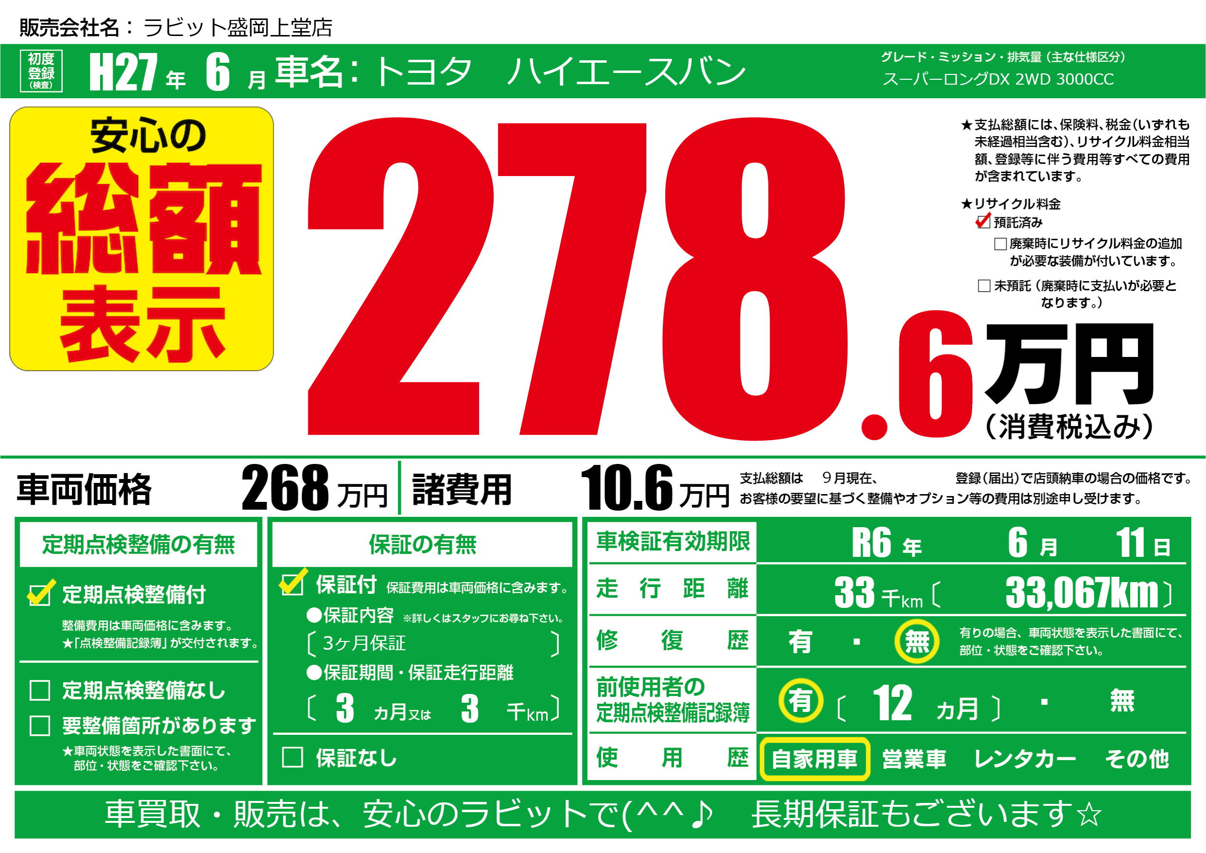 | 走行キロ | 3.3万km | 初年度登録 | H27年6月 |