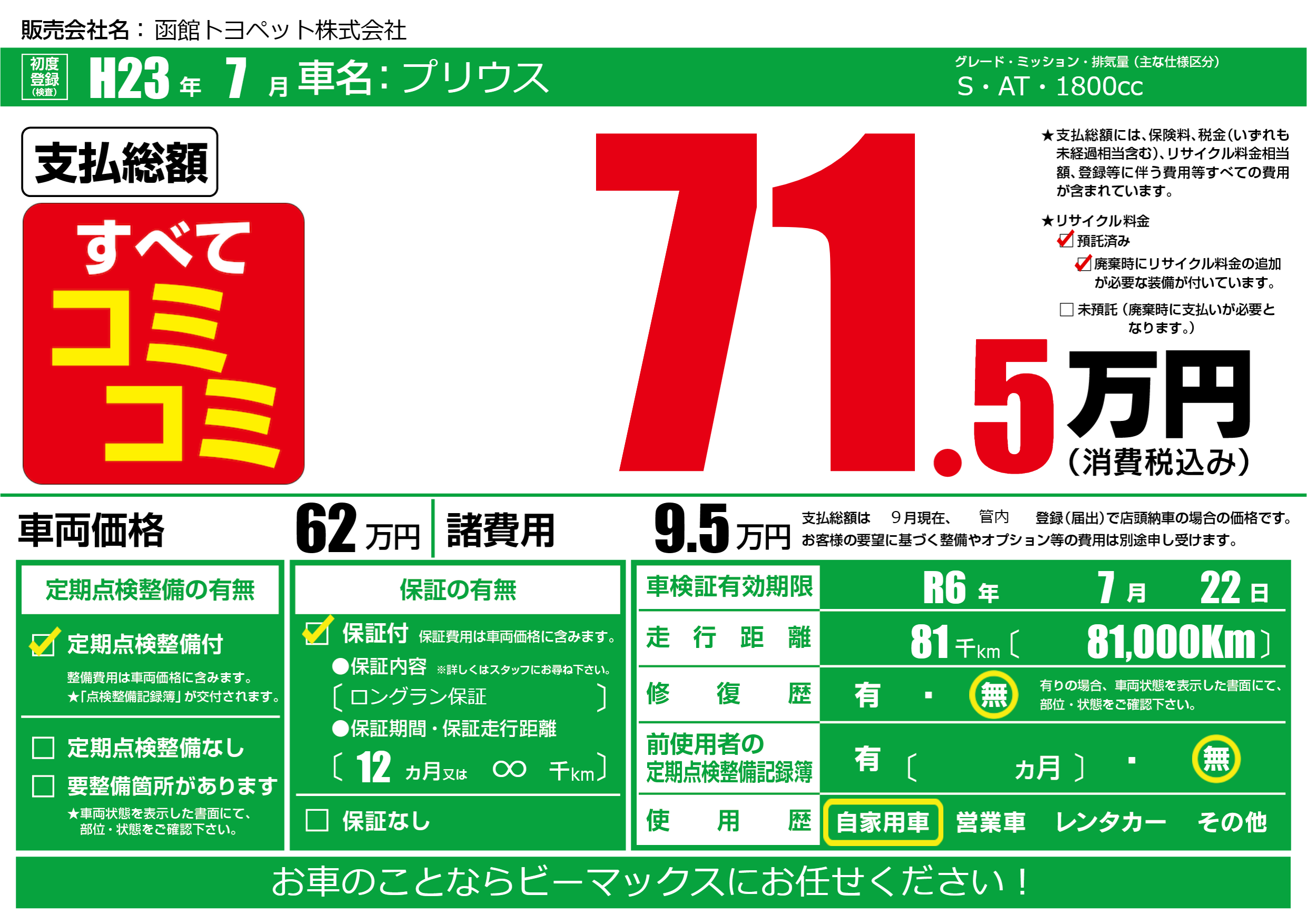 | 車名 | プリウス | グレード ミッション 排気量 |