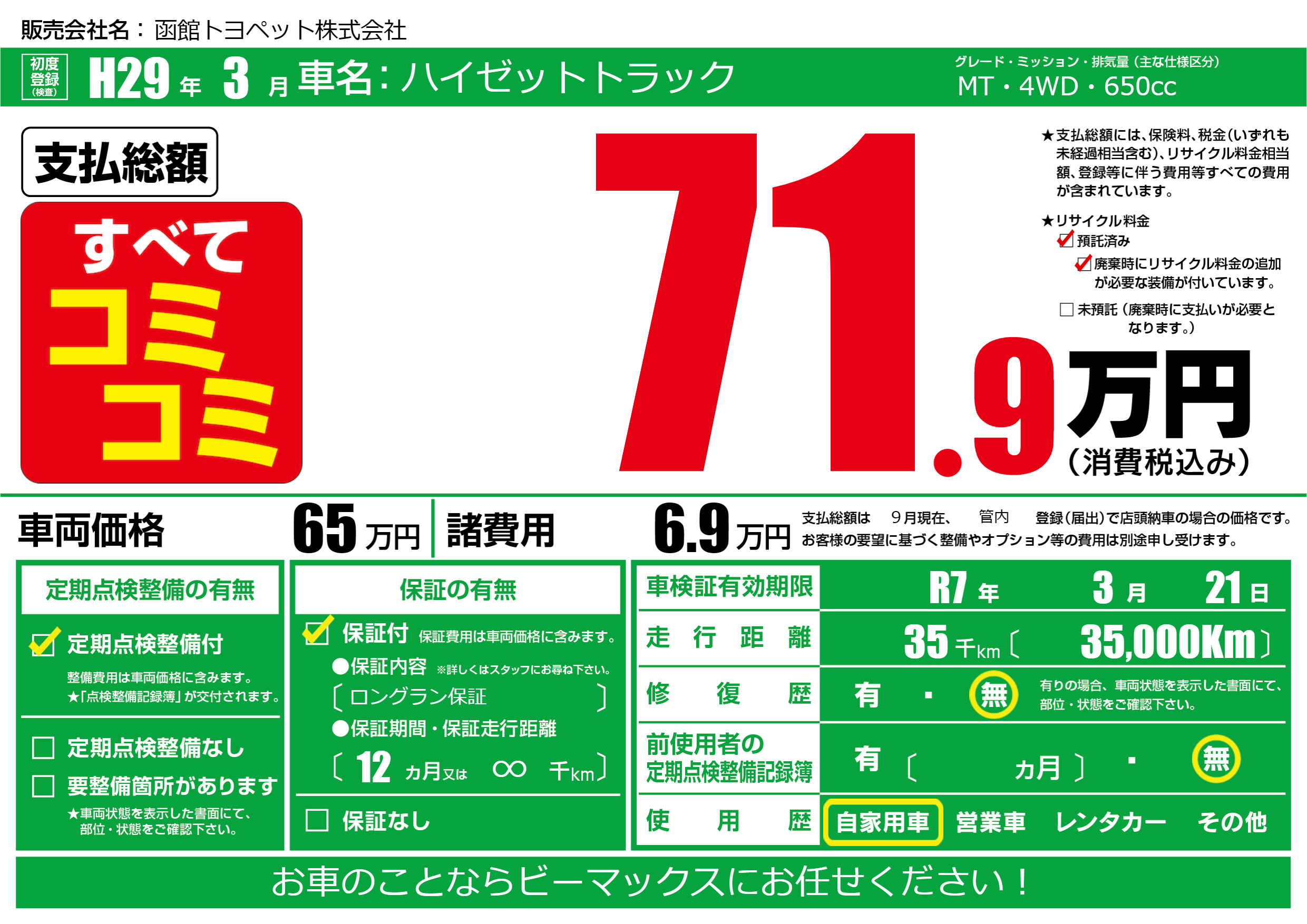 | 走行キロ | 3.5万km | 初年度登録 | H29年3月 |