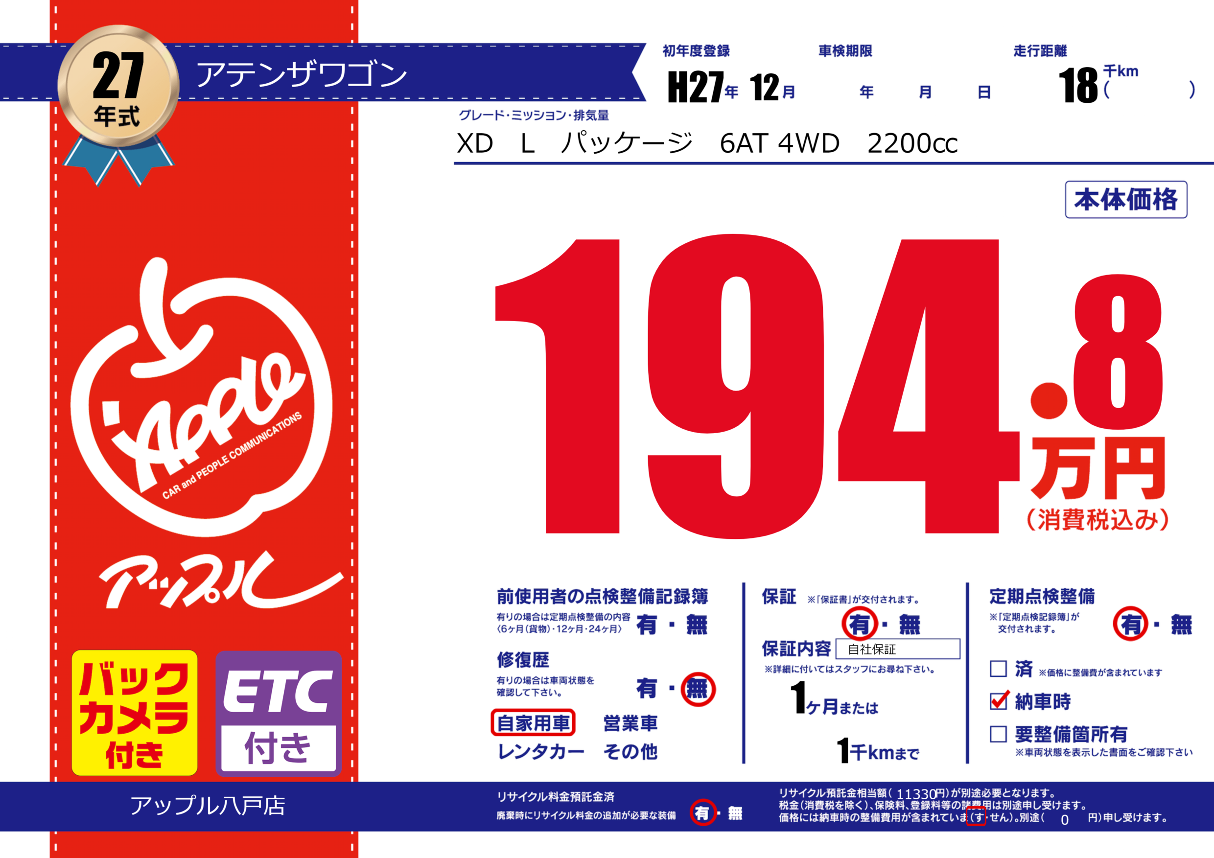 | 車名 | アテンザワゴン | グレード ミッション 排気量 |