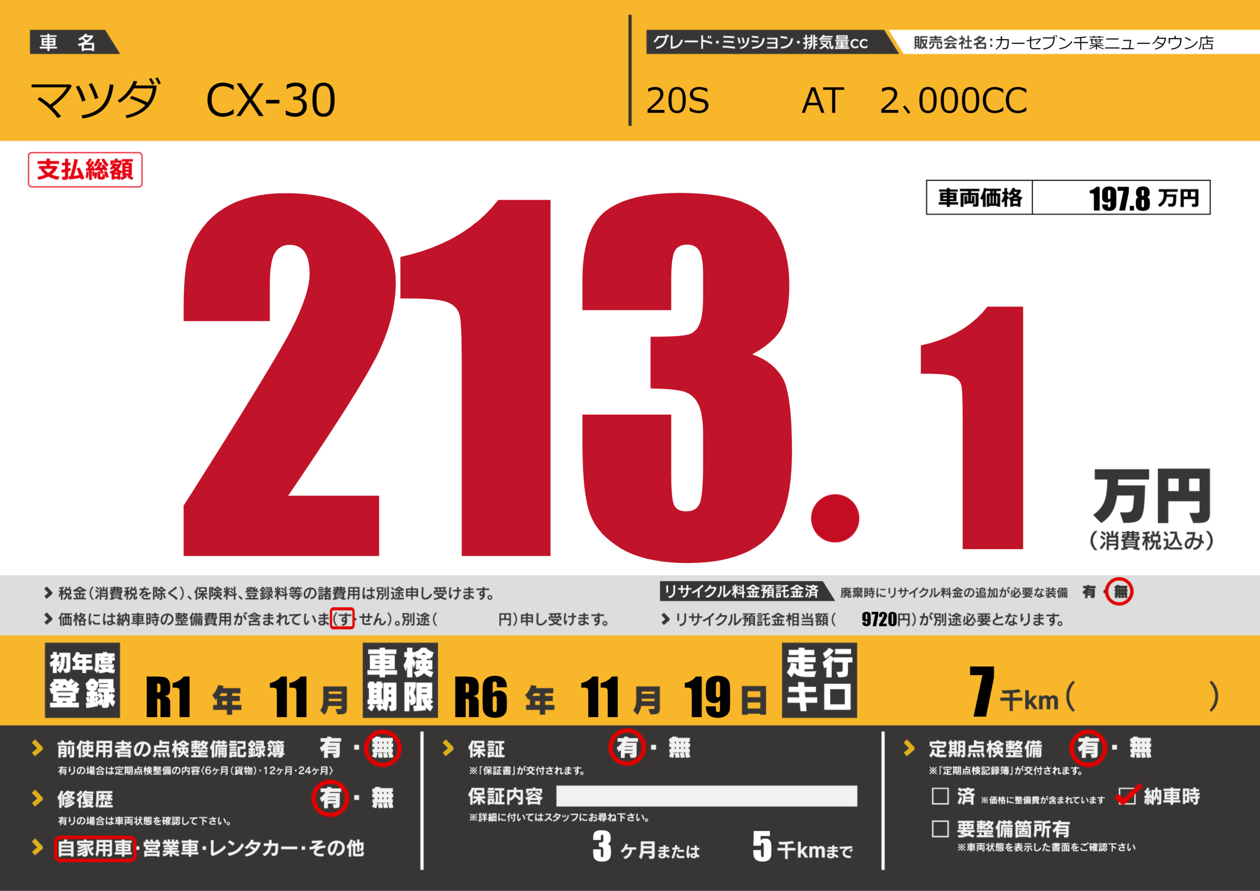 | 車名 | マツダ CX-30 | グレード ミッション 排気量 |