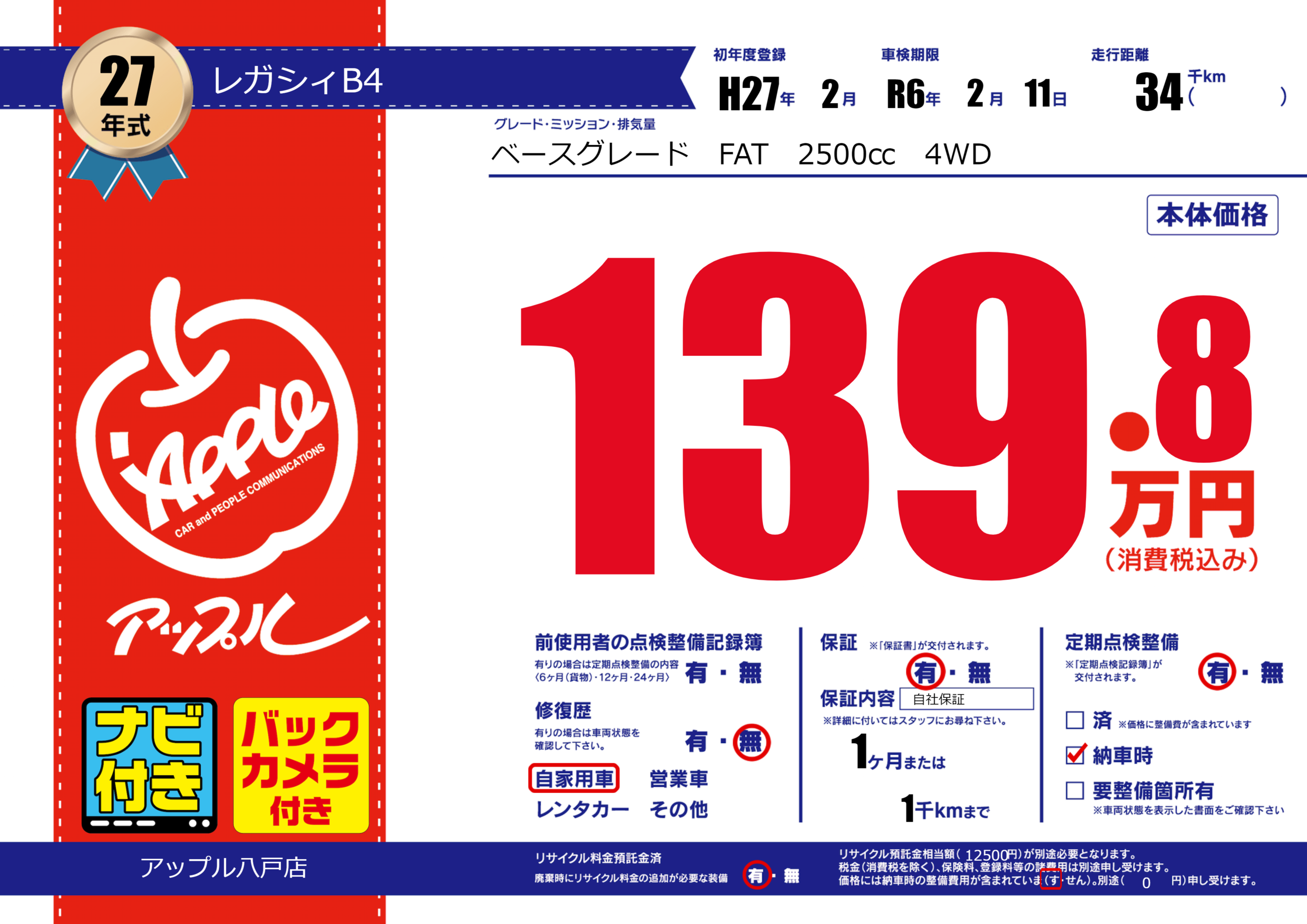 | 定期点検整備 | 定期点検整備あり 納車時あり | ||