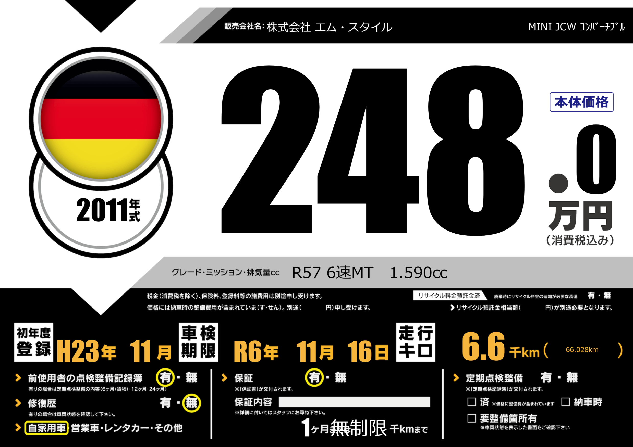 | 車名 | MINI JCW コンバーチブル | グレード ミッション 排気量 |