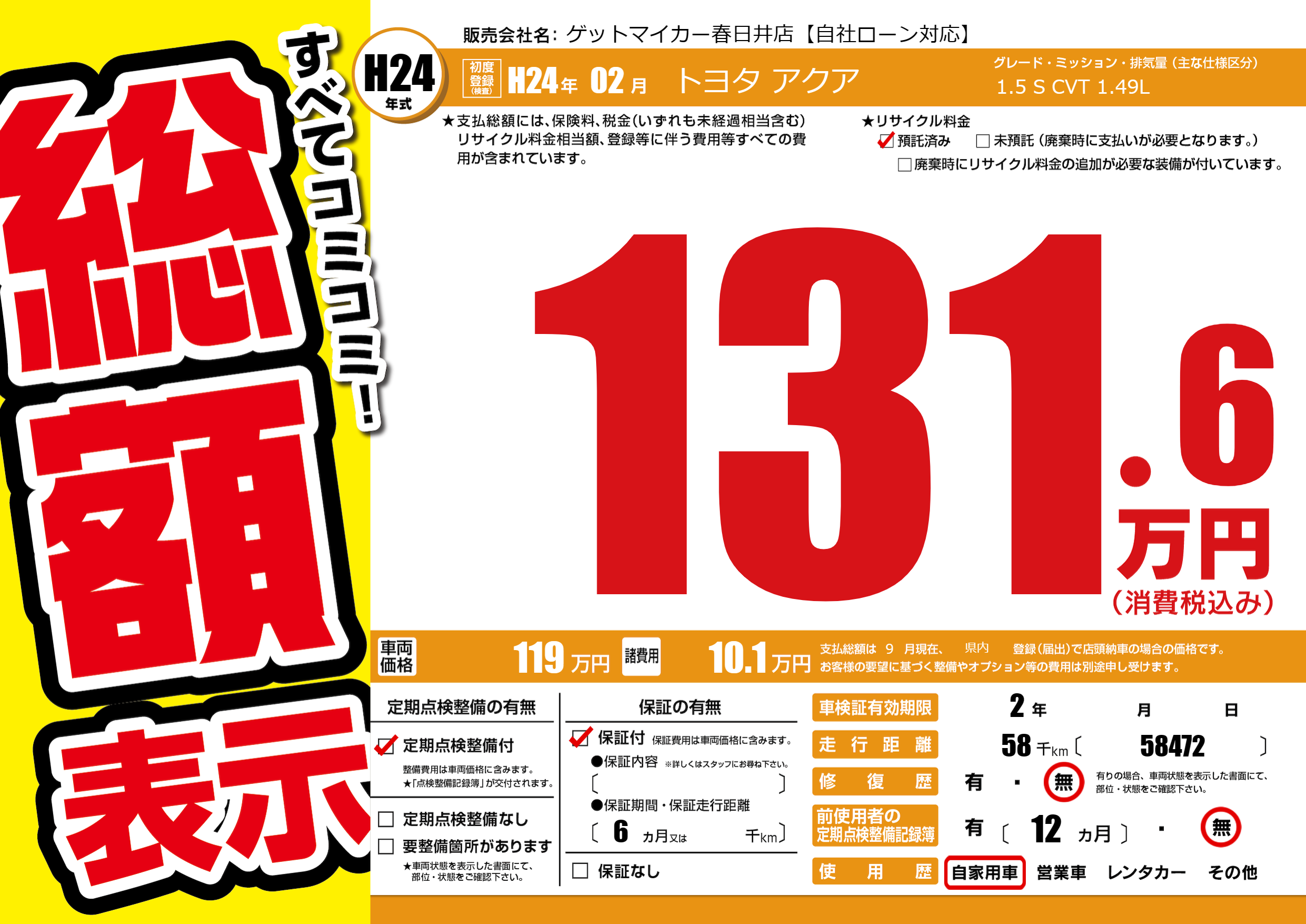 | 車名 | トヨタ アクア | グレード ミッション 排気量 |