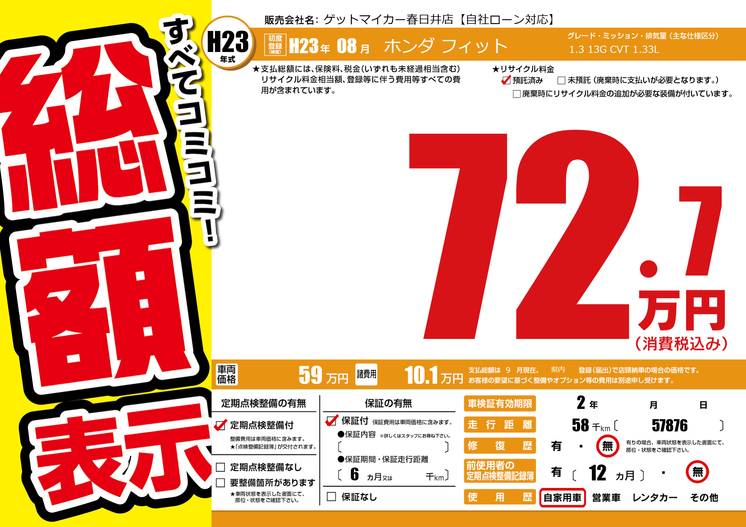 | 車名 | ホンダ フィット | グレード ミッション 排気量 |
