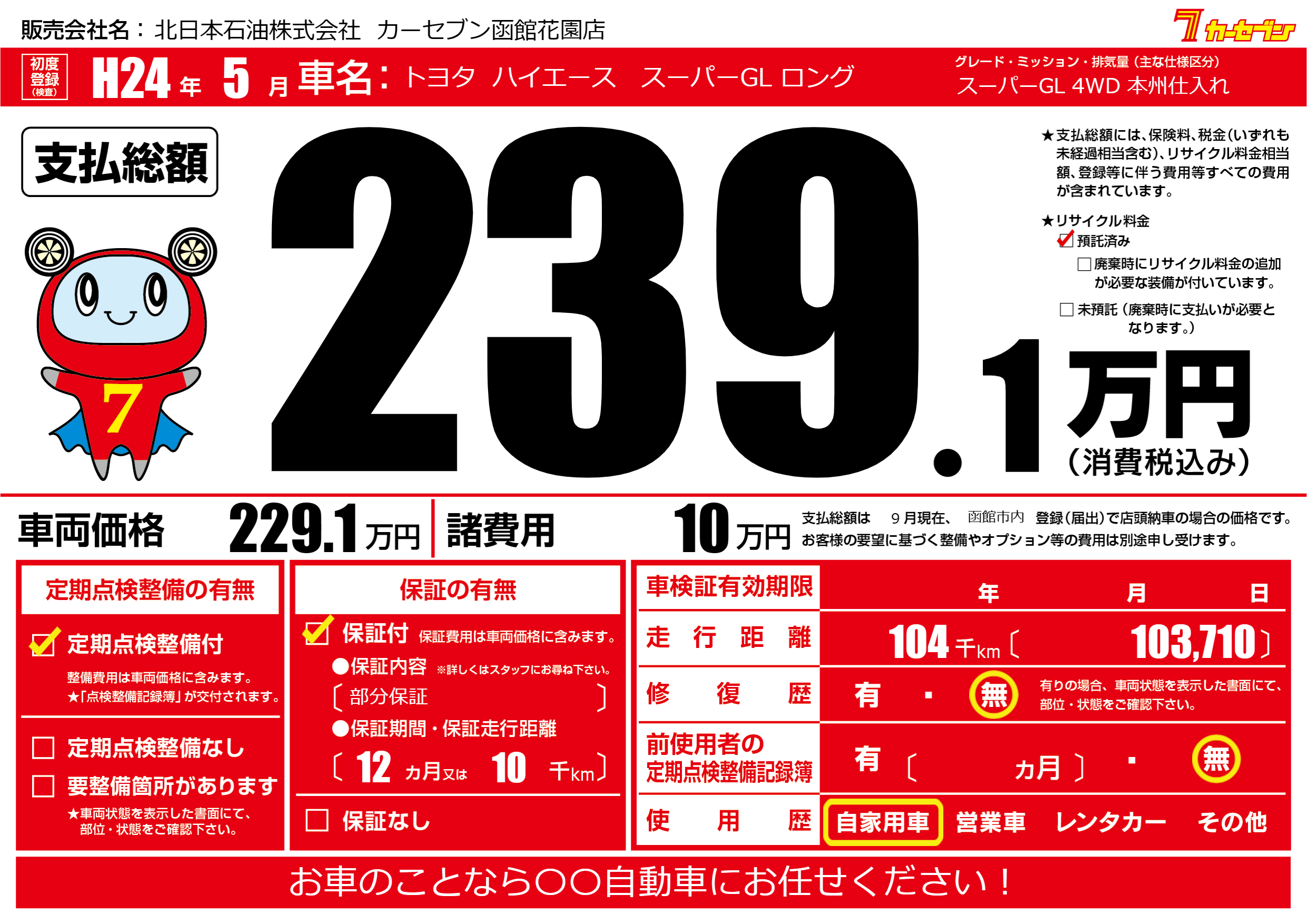 | 走行キロ | 10.4万km | 初年度登録 | H24年5月 |