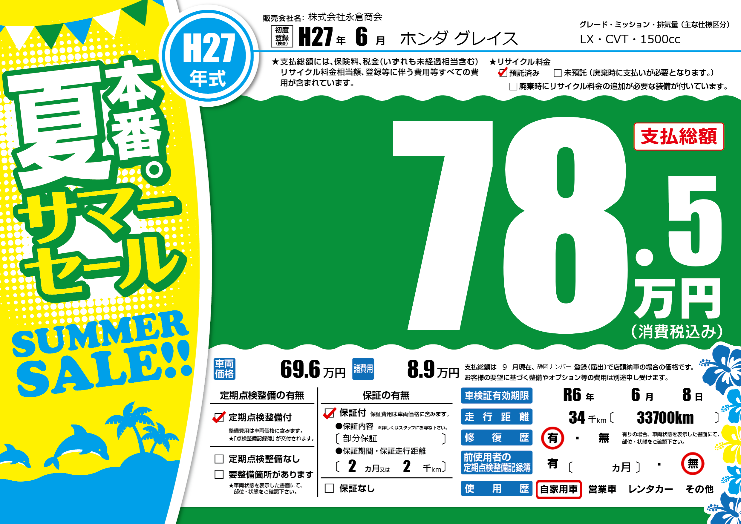 | 走行キロ | 3.4万km | 初年度登録 | H27年6月 |