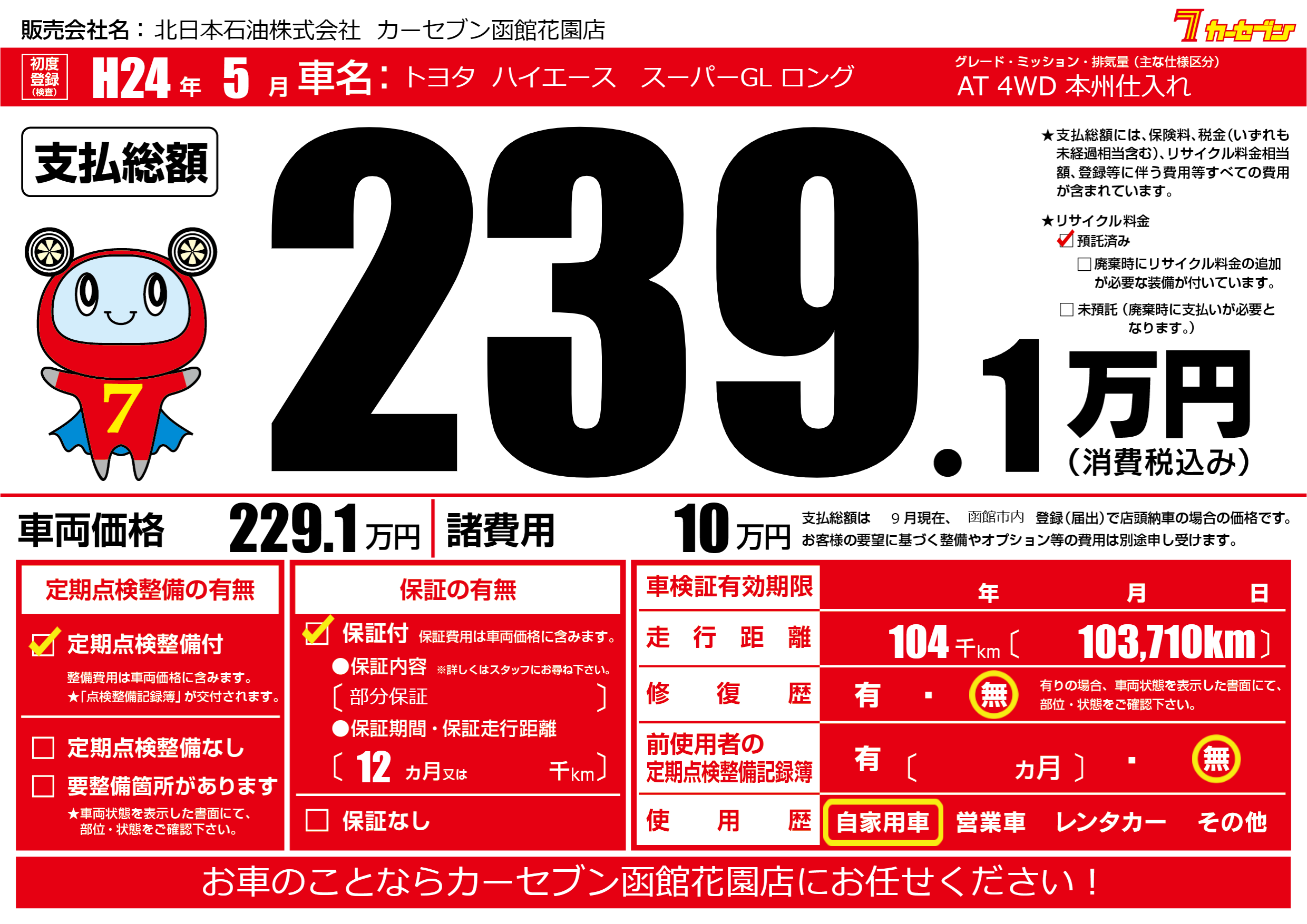| 走行キロ | 10.4万km | 初年度登録 | H24年5月 |