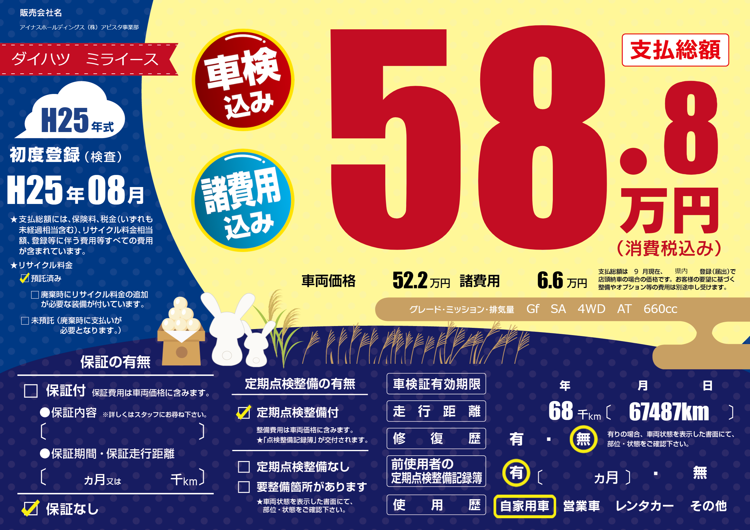| 走行キロ | 6.8万km | 初年度登録 | H25年08月 |