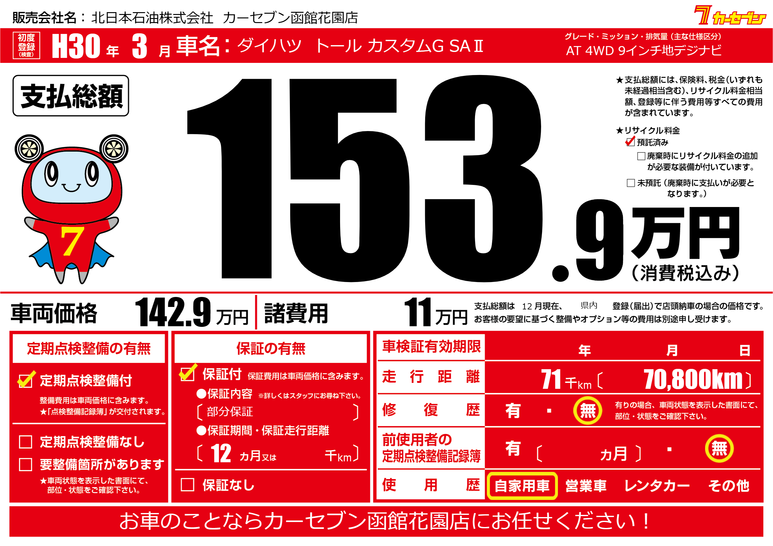 | 走行キロ | 7.1万km | 初年度登録 | H30年3月 |