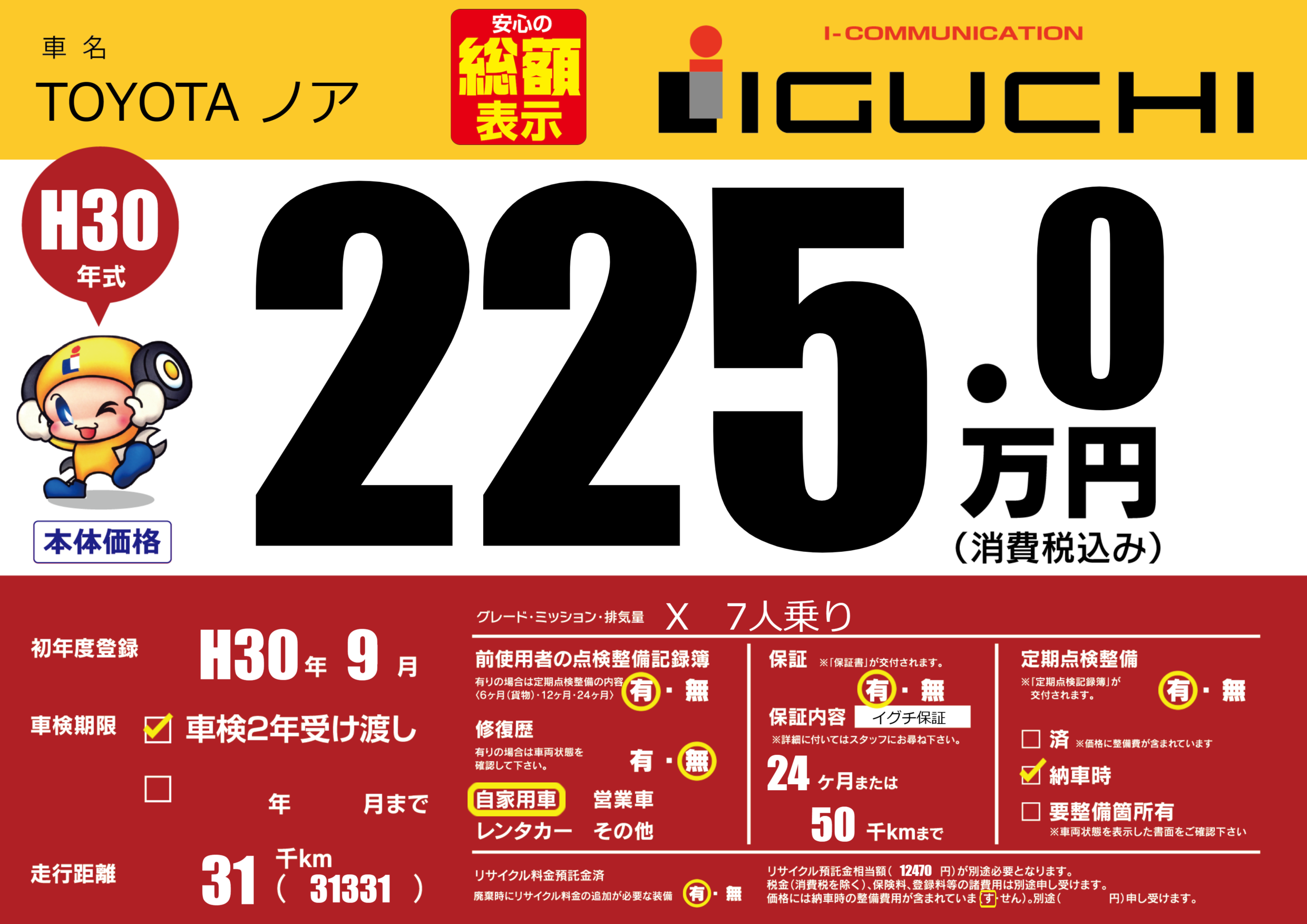 | 車名 | TOYOTA ノア | グレード ミッション 排気量 |