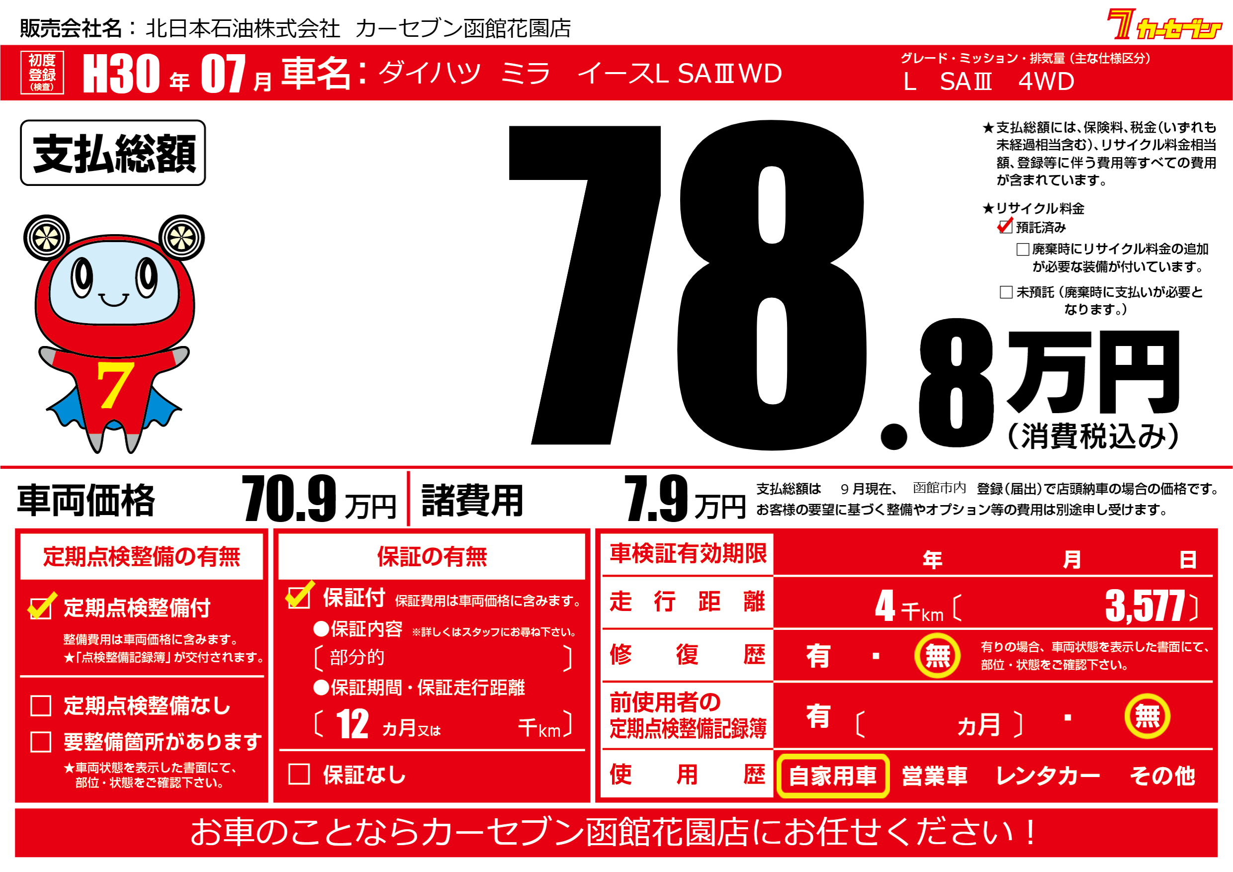 | 車名 | ダイハツ ミラ イースL SAⅢWD | グレード ミッション 排気量 |
