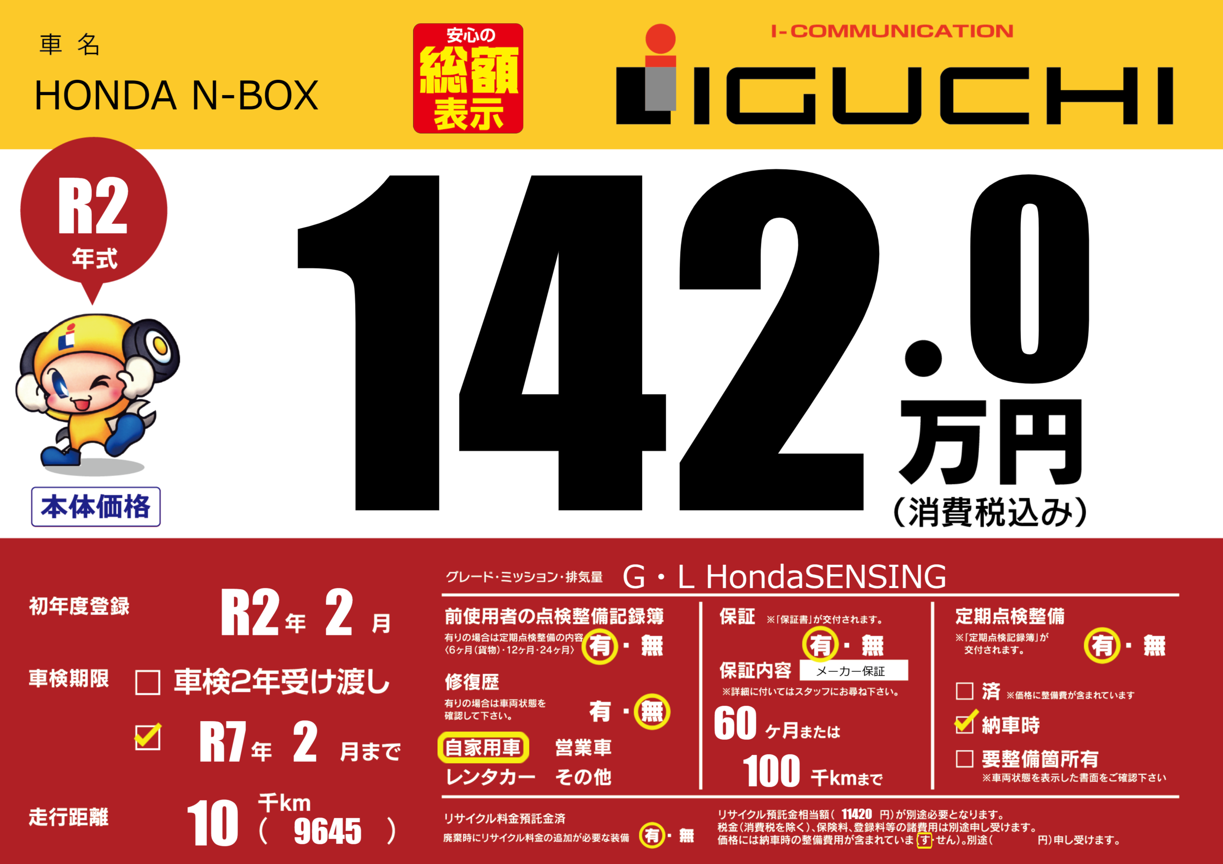 | 車名 | HONDA N-BOX | グレード ミッション 排気量 |