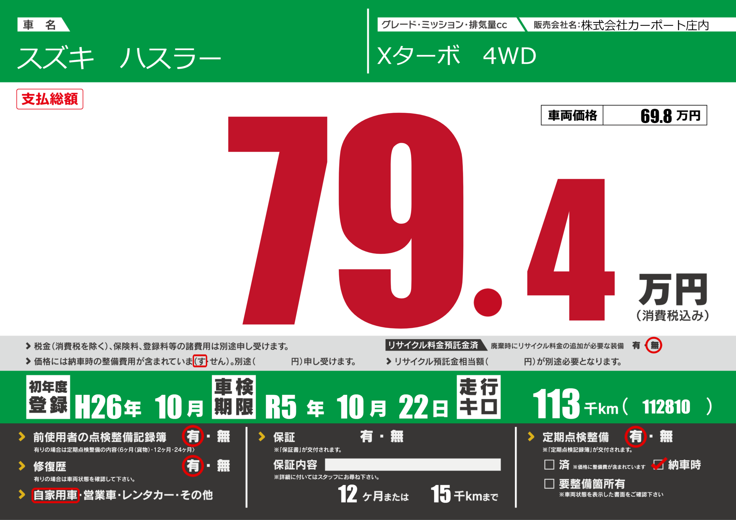 | 定期点検整備 | 定期点検整備あり 納車時あり | ||