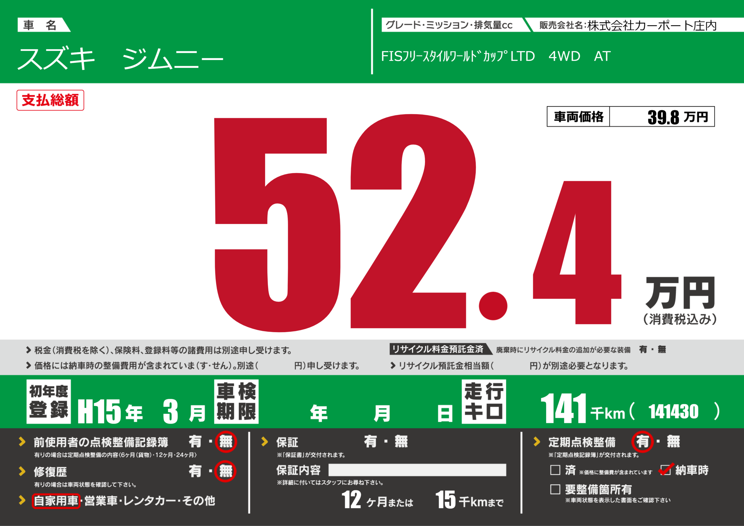 | 走行キロ | 14.1万km | 初年度登録 | H15年3月 |