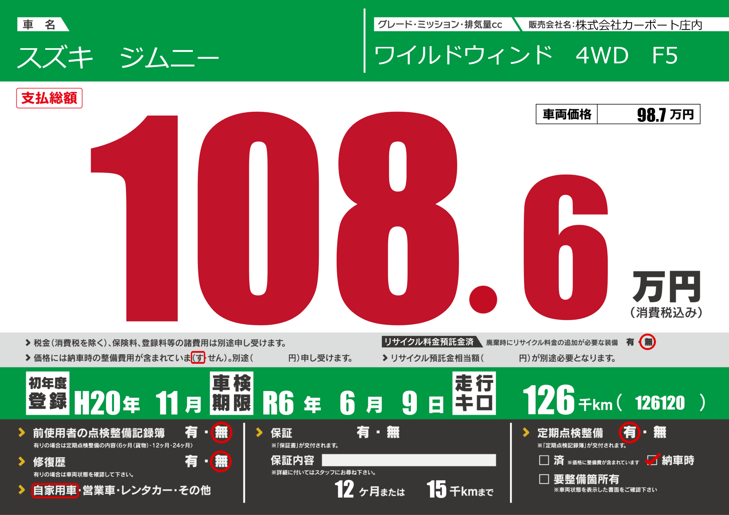 保証なし 保証内容(---) 12ヶ月または(15)千kmまで |