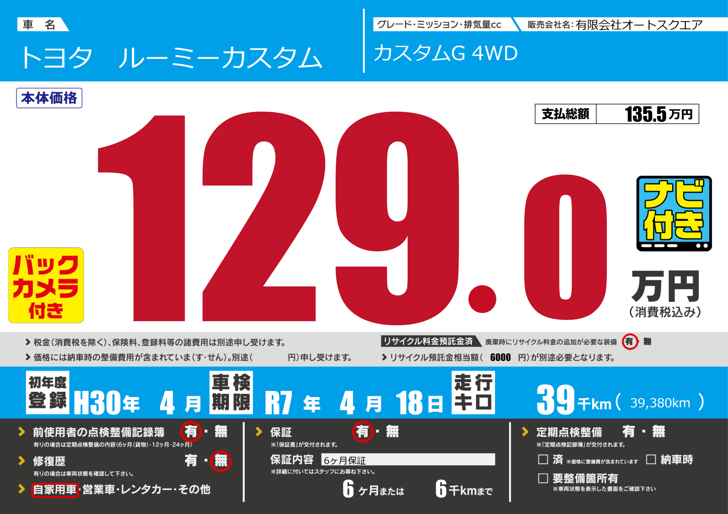| 走行キロ | 3.9万km | 初年度登録 | H30年4月 |