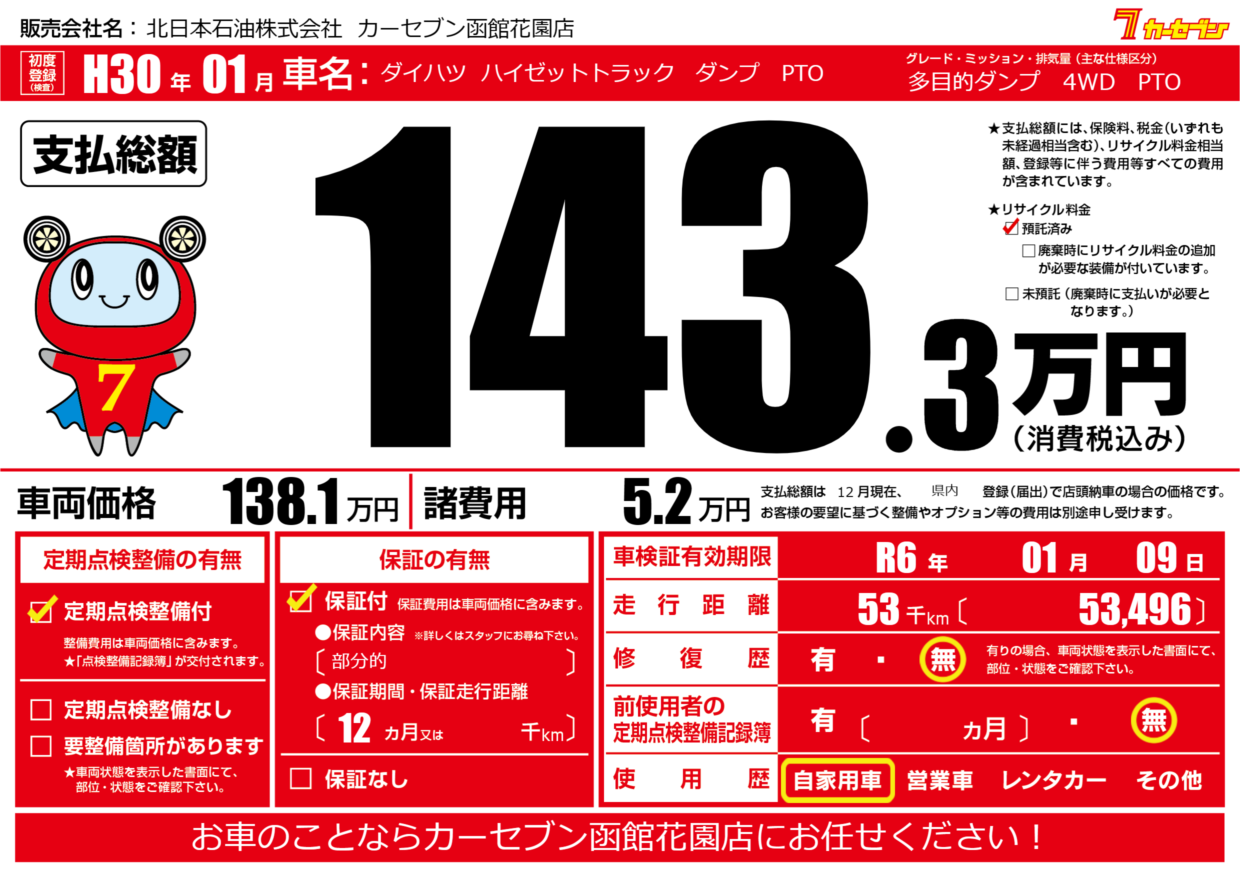 | 走行キロ | 5.3万km | 初年度登録 | H30年01月 |