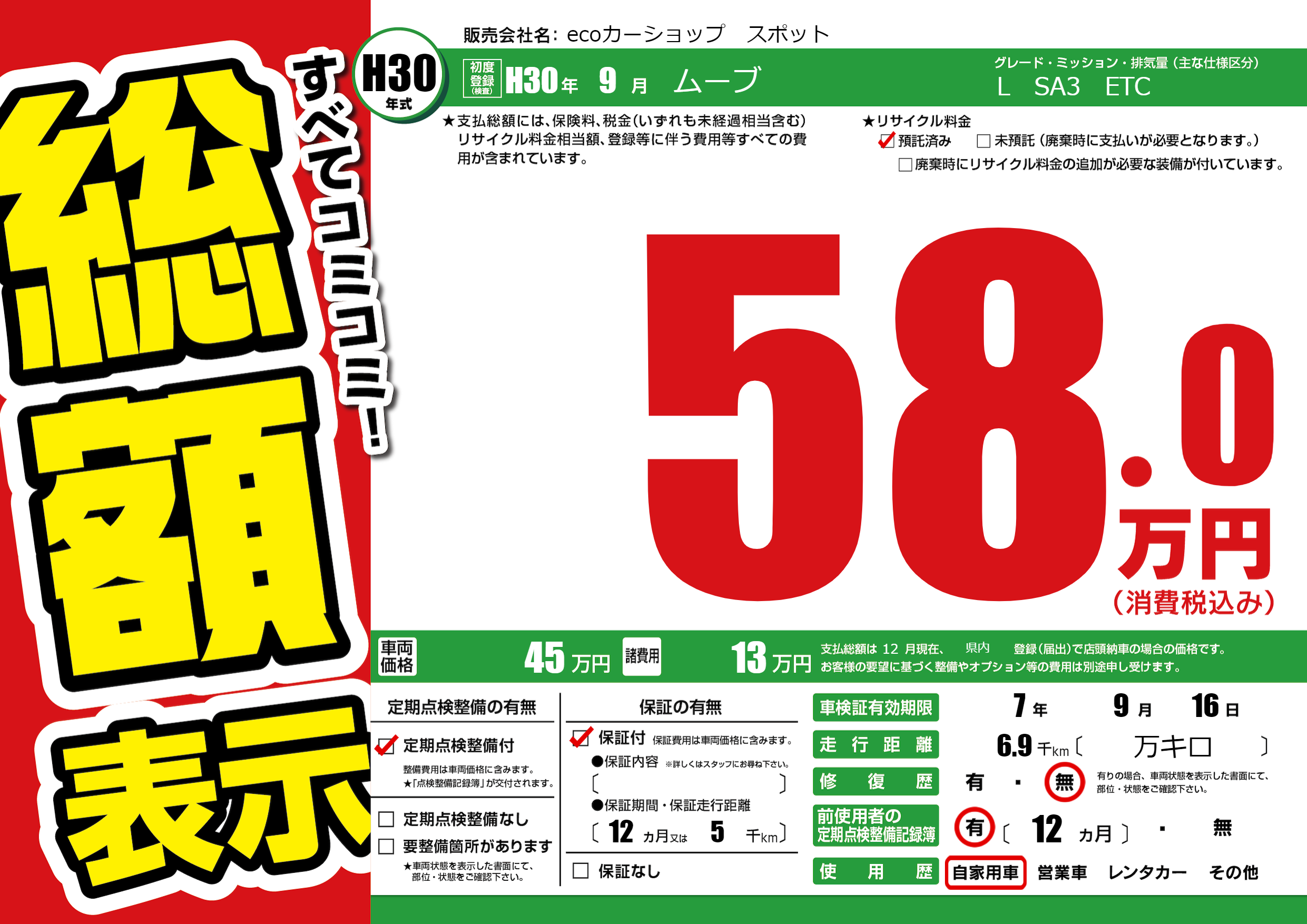 | 走行キロ | 0.6万km | 初年度登録 | H30年9月 |
