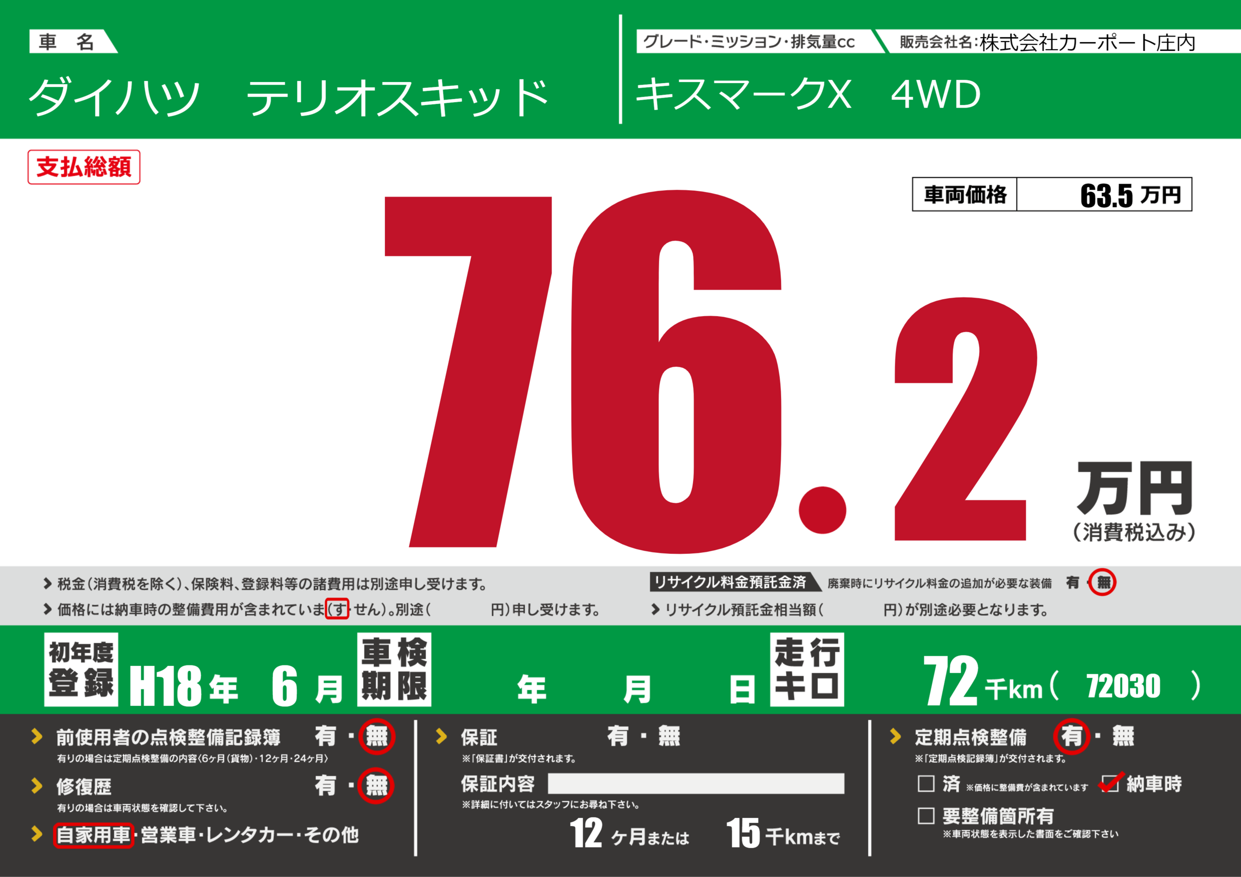| 定期点検整備 | 定期点検整備あり 納車時あり | ||
