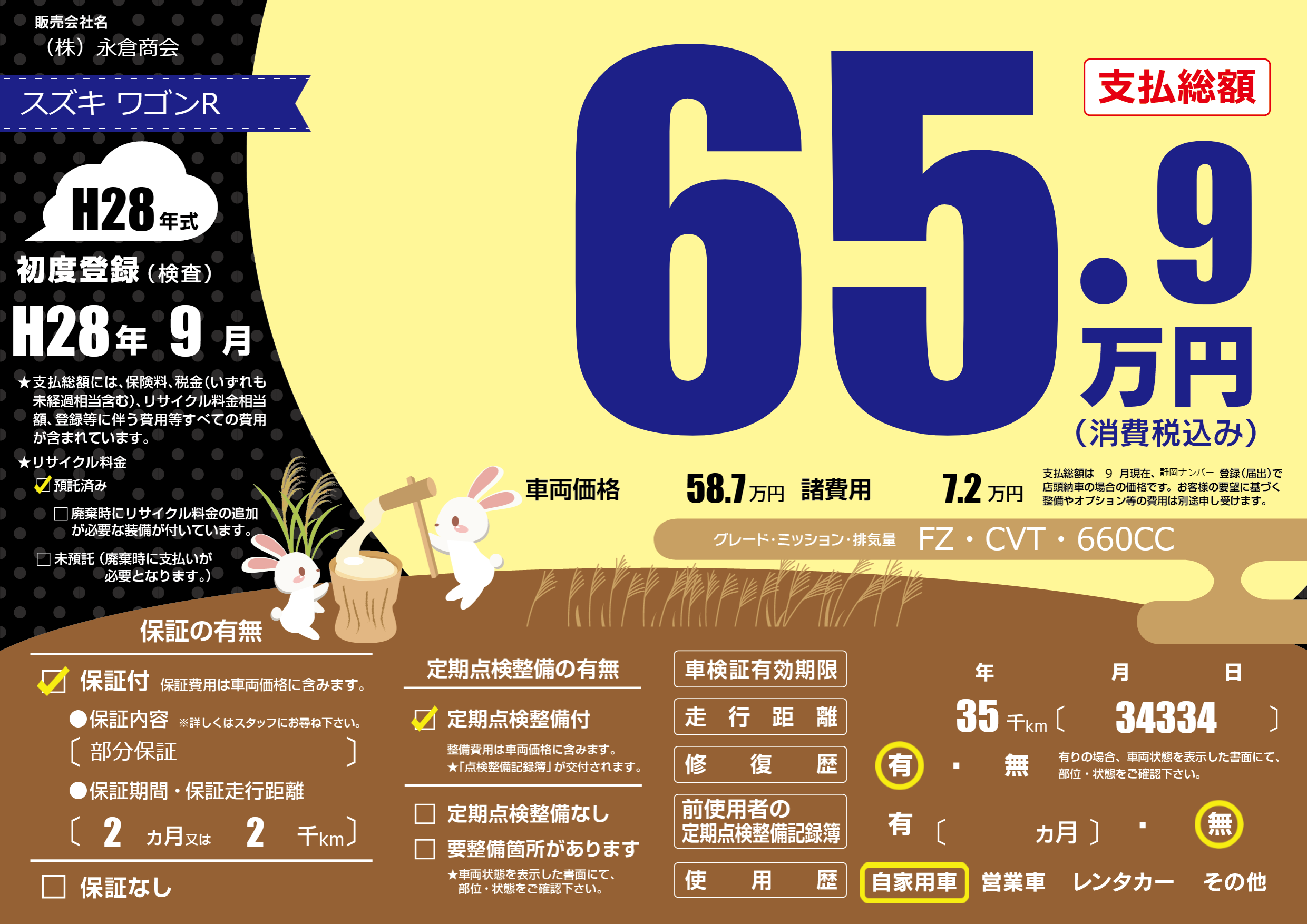 | 車名 | スズキ ワゴンR | グレード ミッション 排気量 |