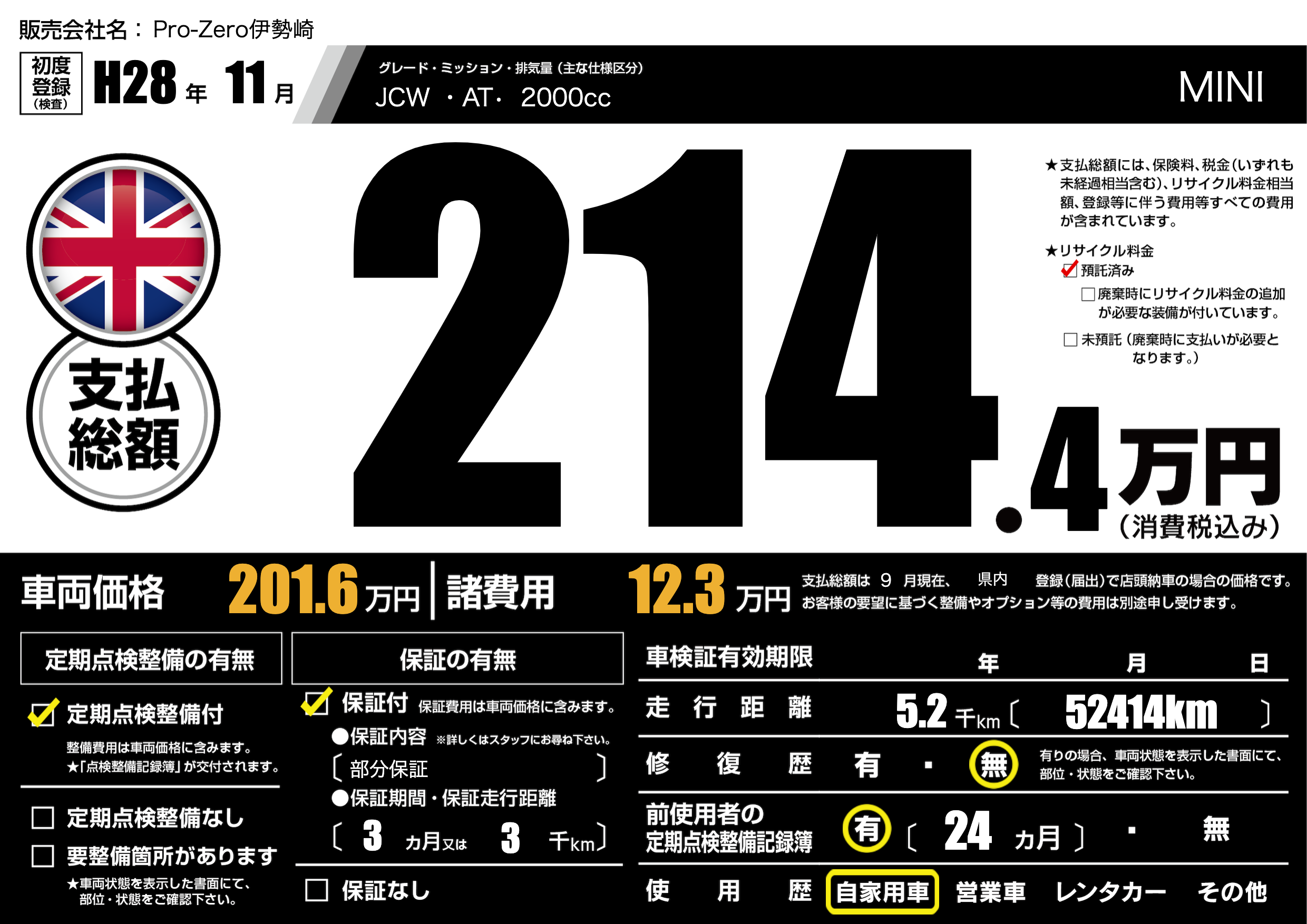 | 車名 | JCW ・AT• 2000cc | グレード ミッション 排気量 |