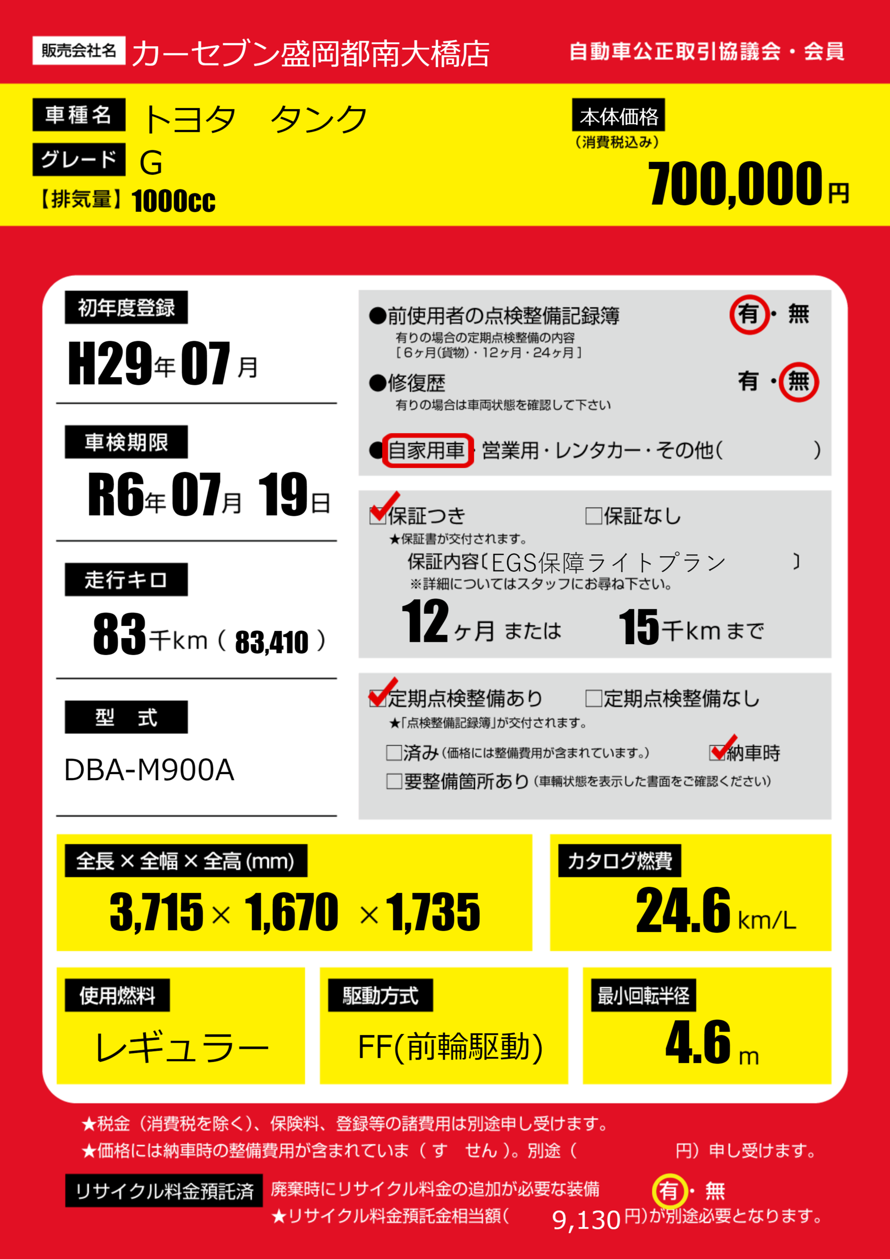 保証付き 保証内容(EGS保障ライトプラン) 12ヶ月または(15)千kmまで |
