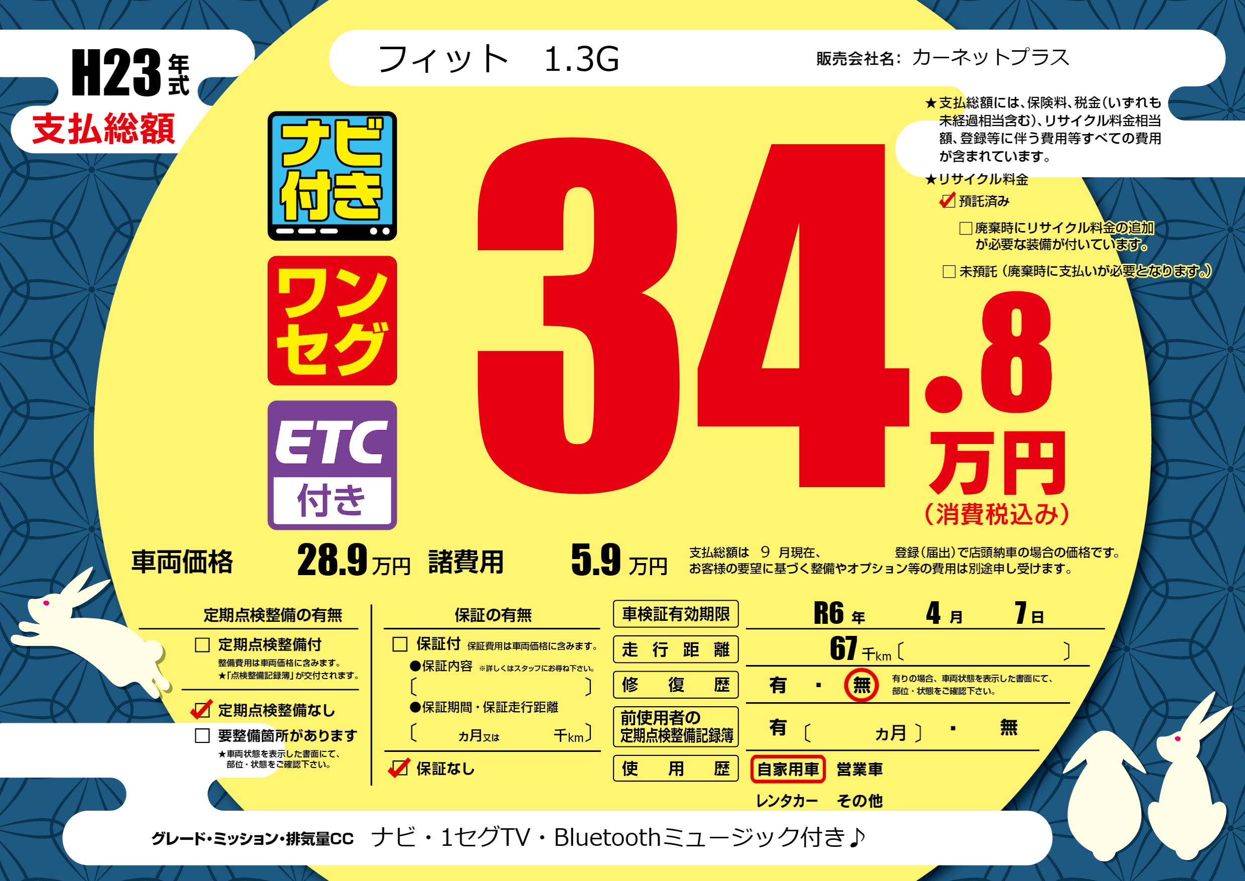 | 車名 | フィット 1.3G | グレード ミッション 排気量 |