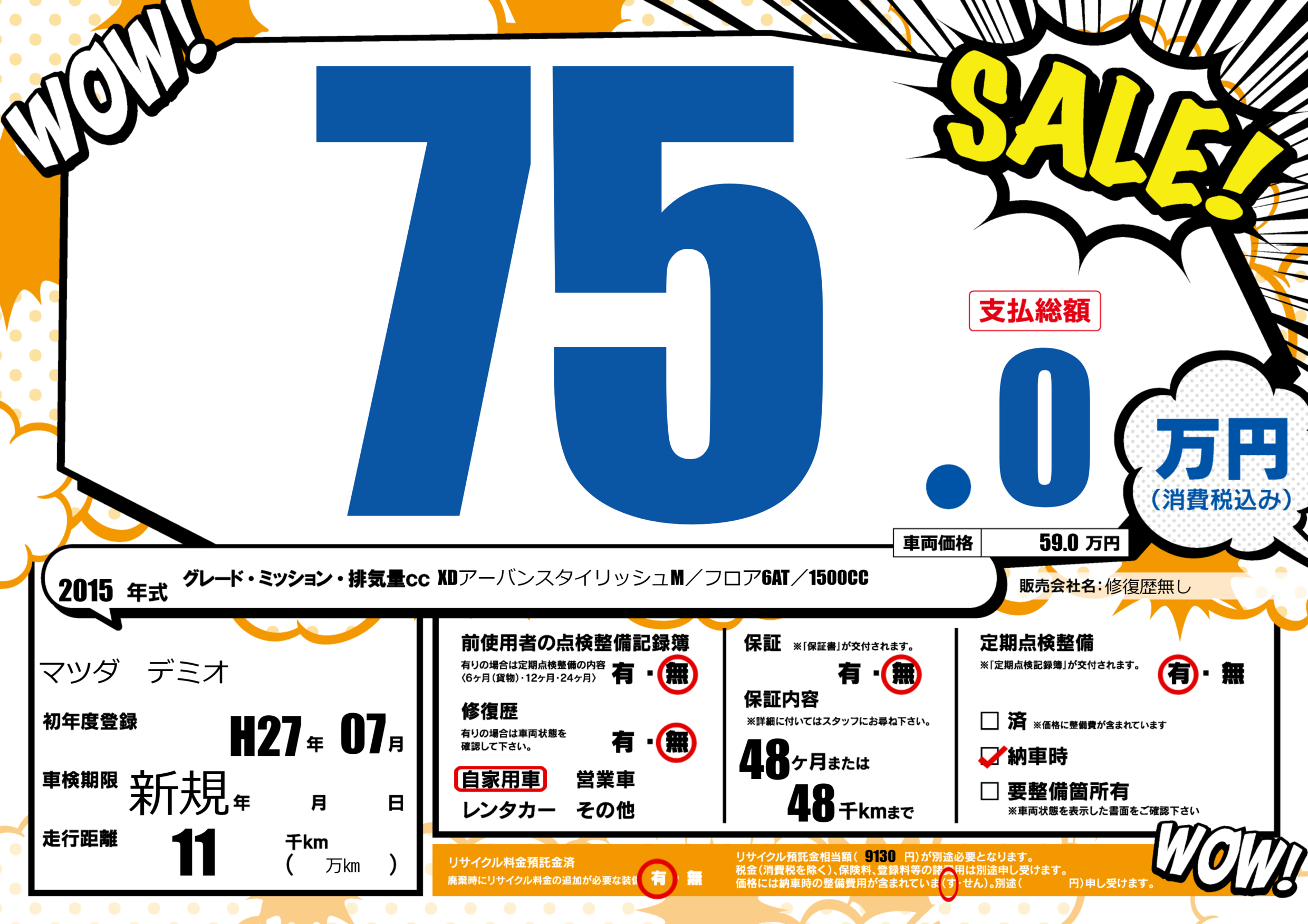 | 車名 | マツダ デミオ | グレード ミッション 排気量 |