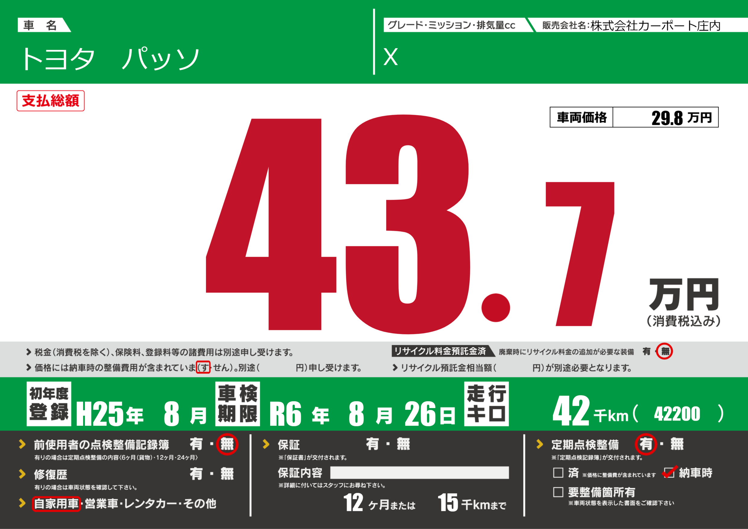 | 定期点検整備 | 定期点検整備あり 納車時あり | ||