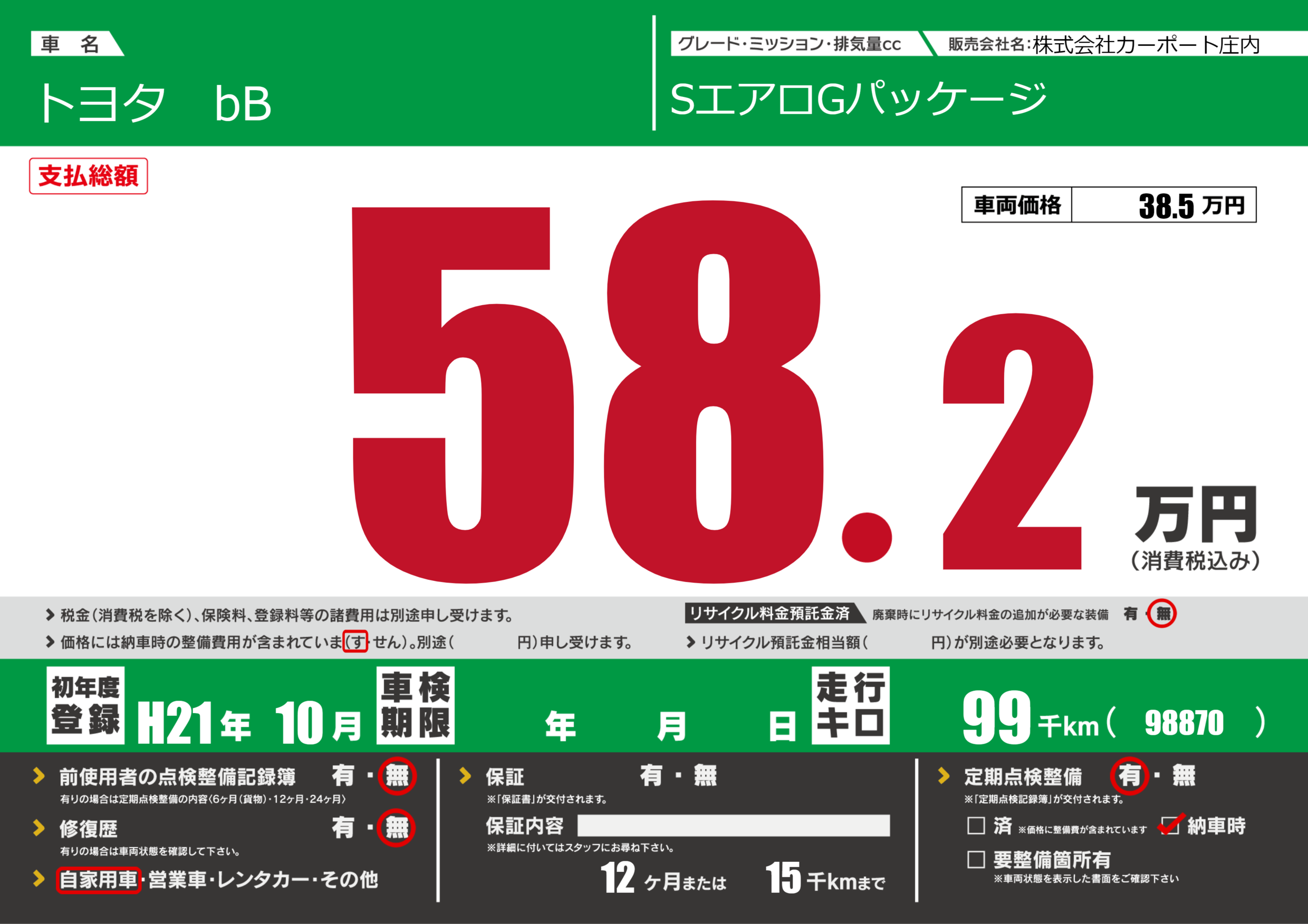 | 車名 | トヨタ bB | グレード ミッション 排気量 |