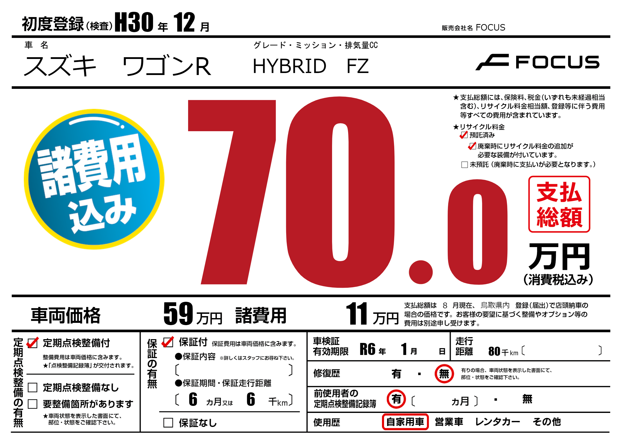 | 車検制限 | R6年 1月 - 日 | ||