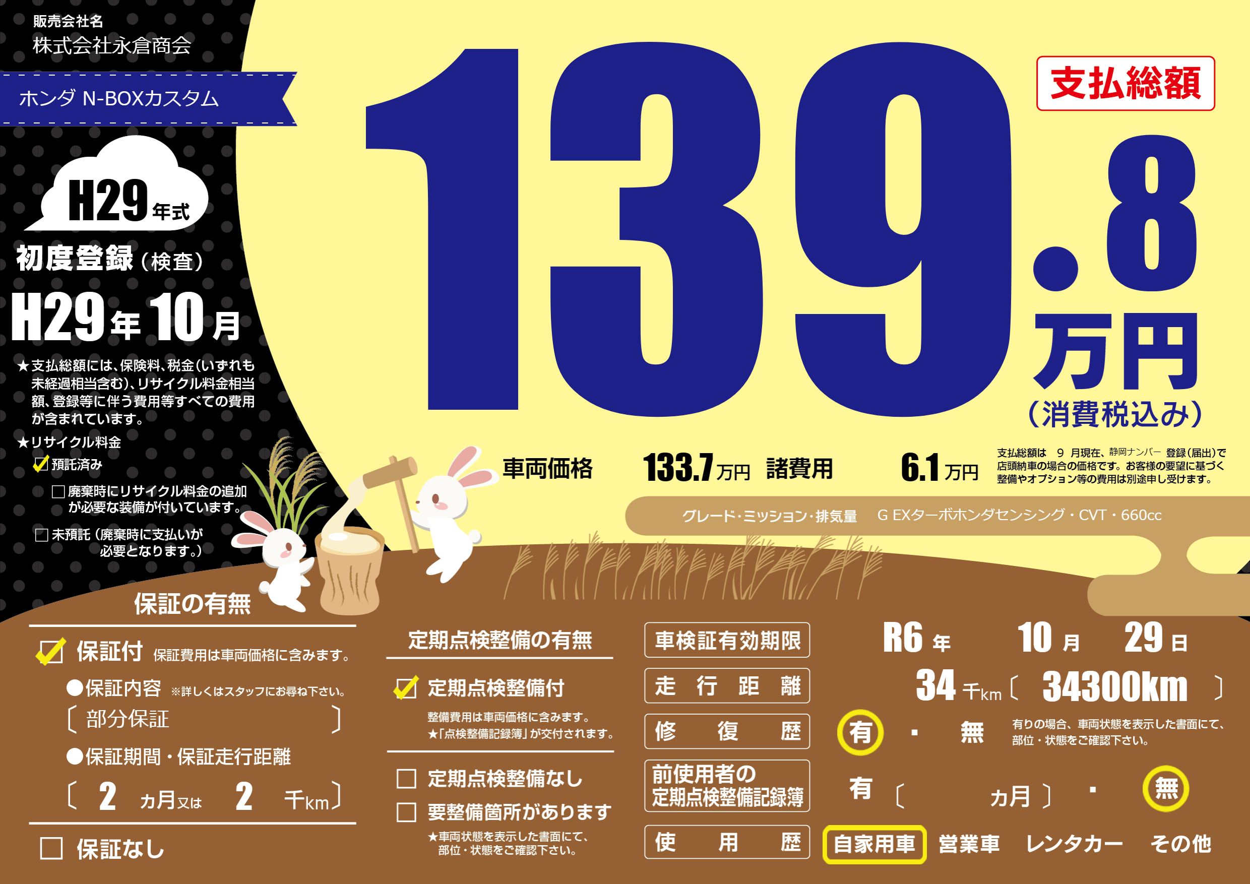 | 走行キロ | 3.4万km | 初年度登録 | H29年10月 |
