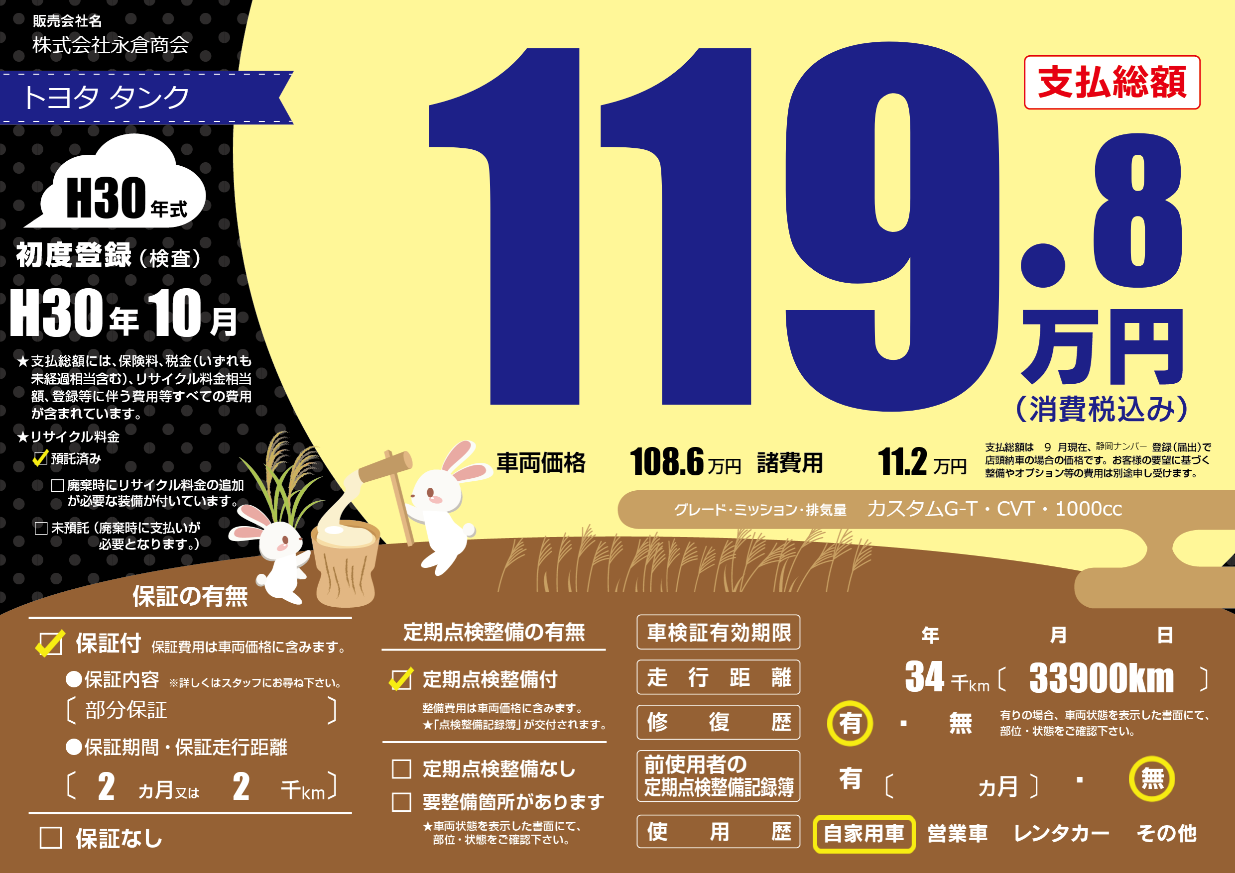 | 車名 | トヨタ タンク | グレード ミッション 排気量 |