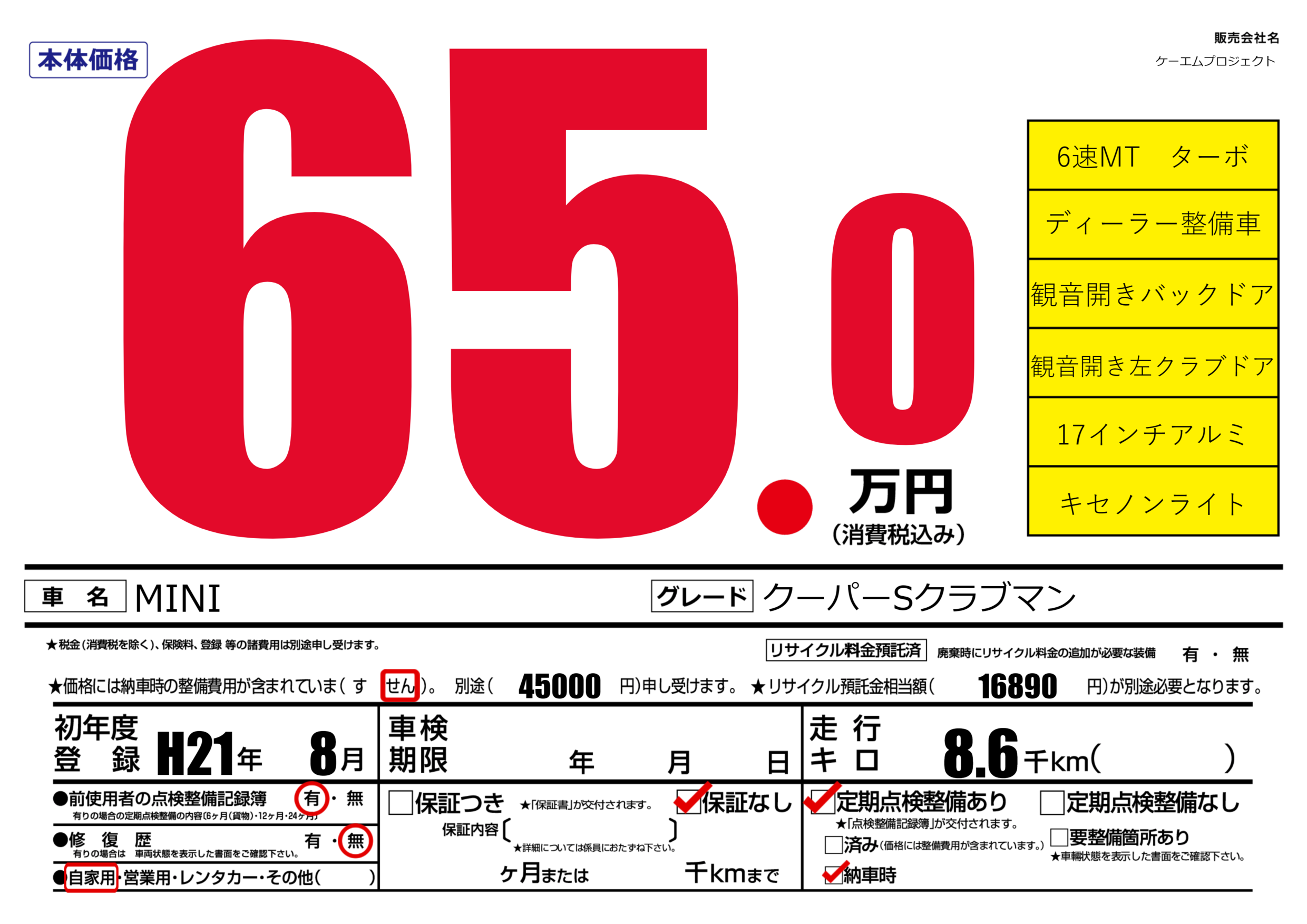 | 走行キロ | 0.8万km | 初年度登録 | H21年8月 |