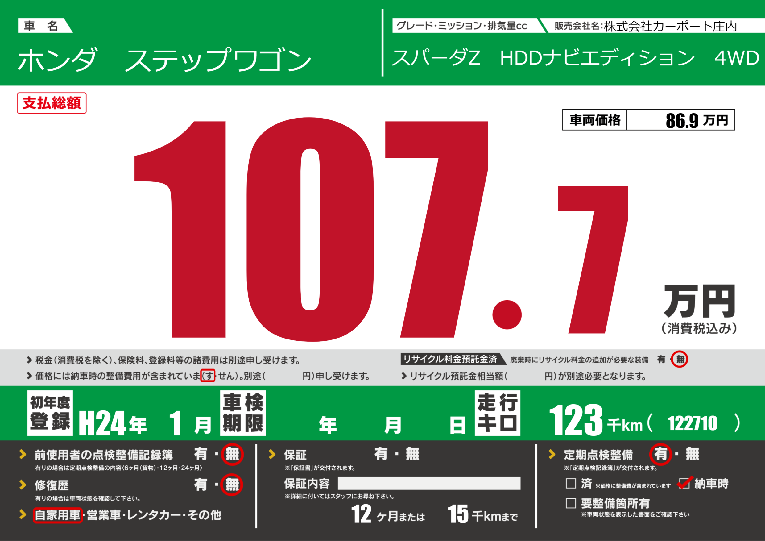 | 定期点検整備 | 定期点検整備あり 納車時あり | ||