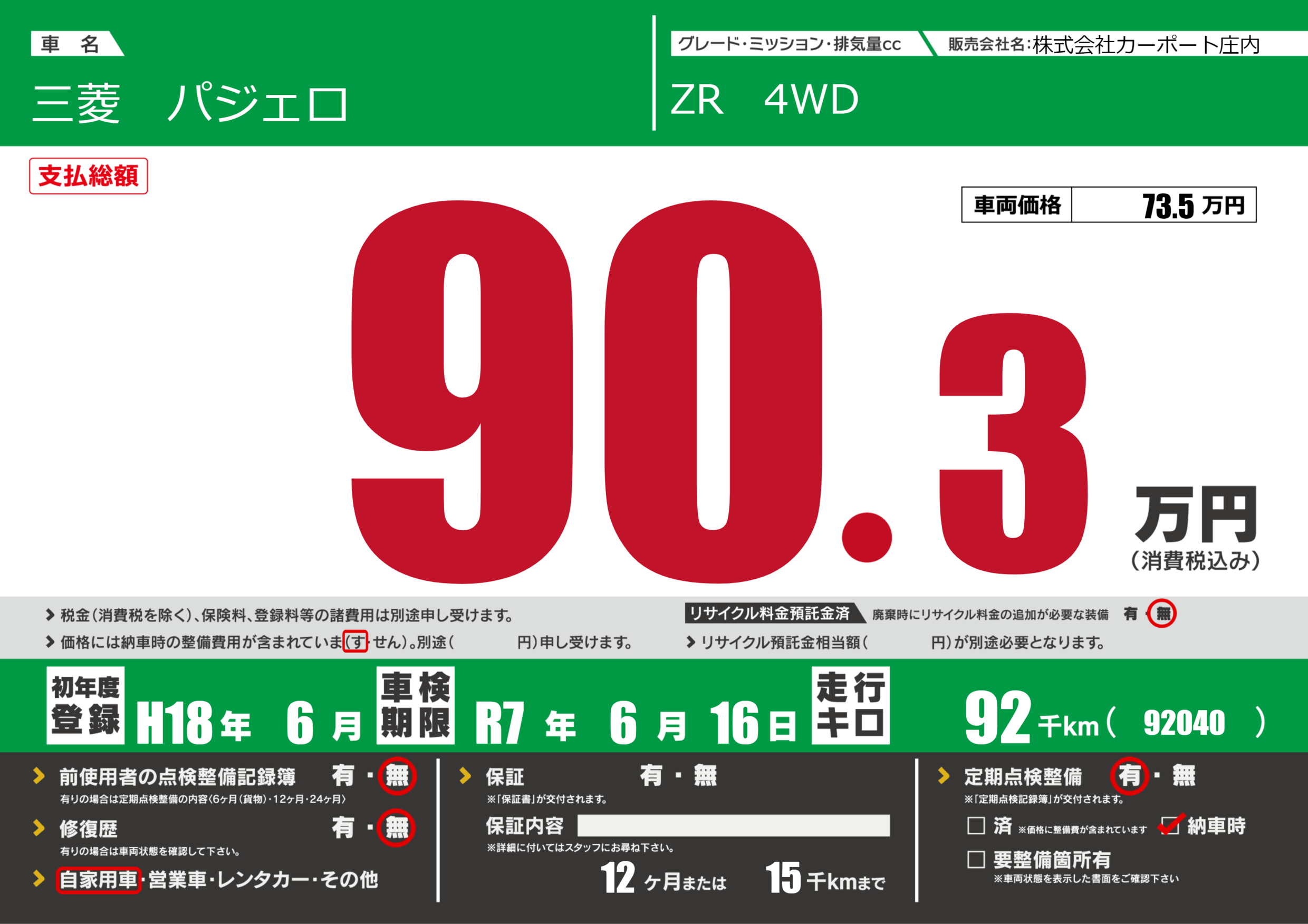 | 走行キロ | 9.2万km | 初年度登録 | H18年6月 |