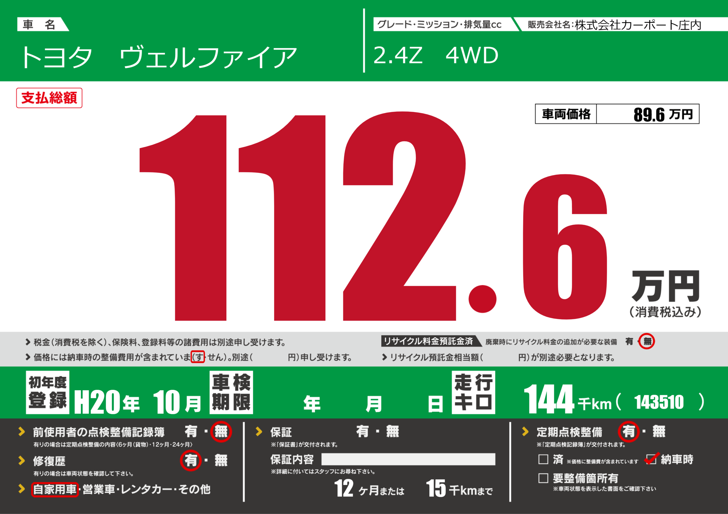 | 定期点検整備 | 定期点検整備あり 納車時あり | ||