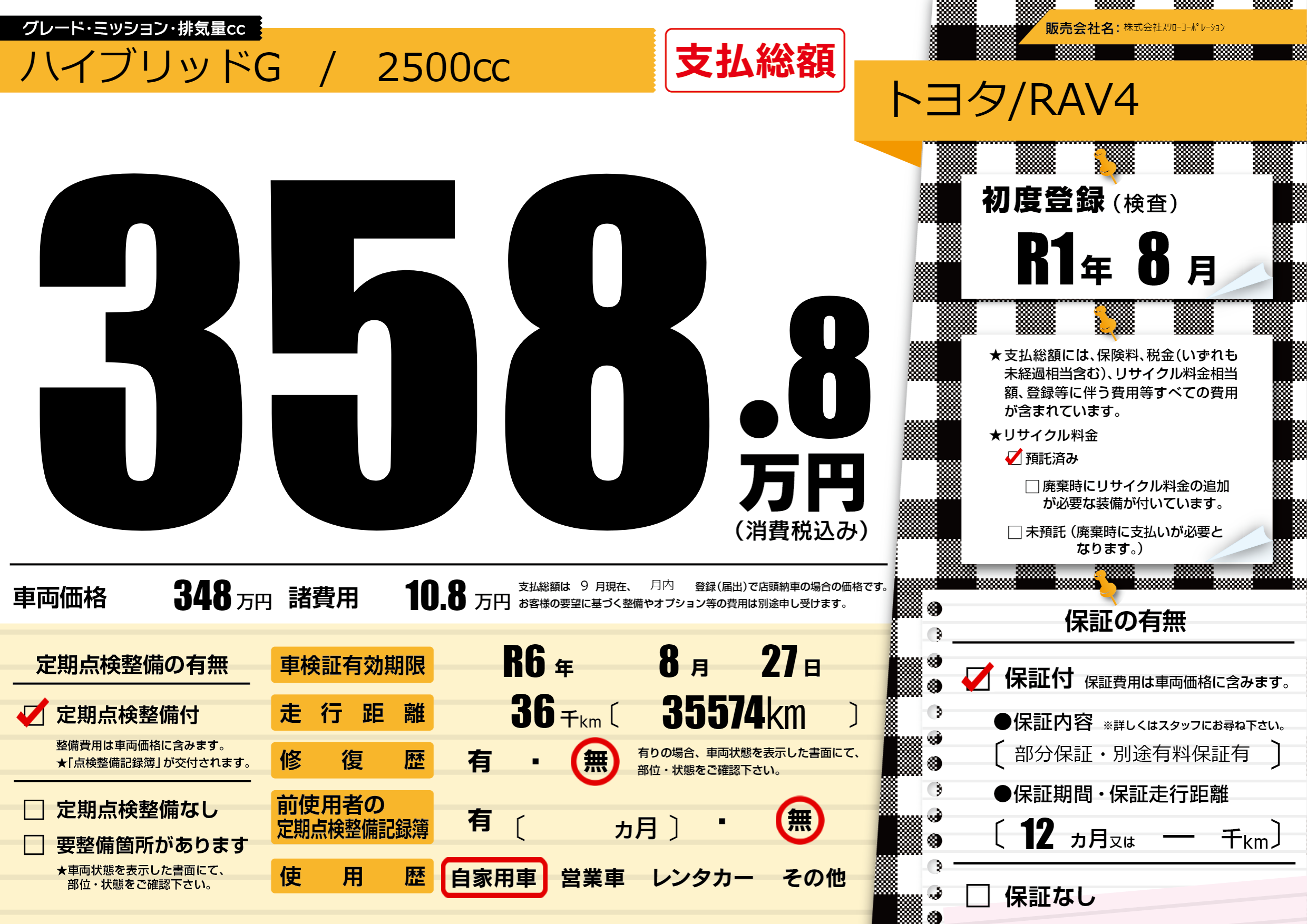 | 車名 | トヨタ/RAV4 | グレード ミッション 排気量 |