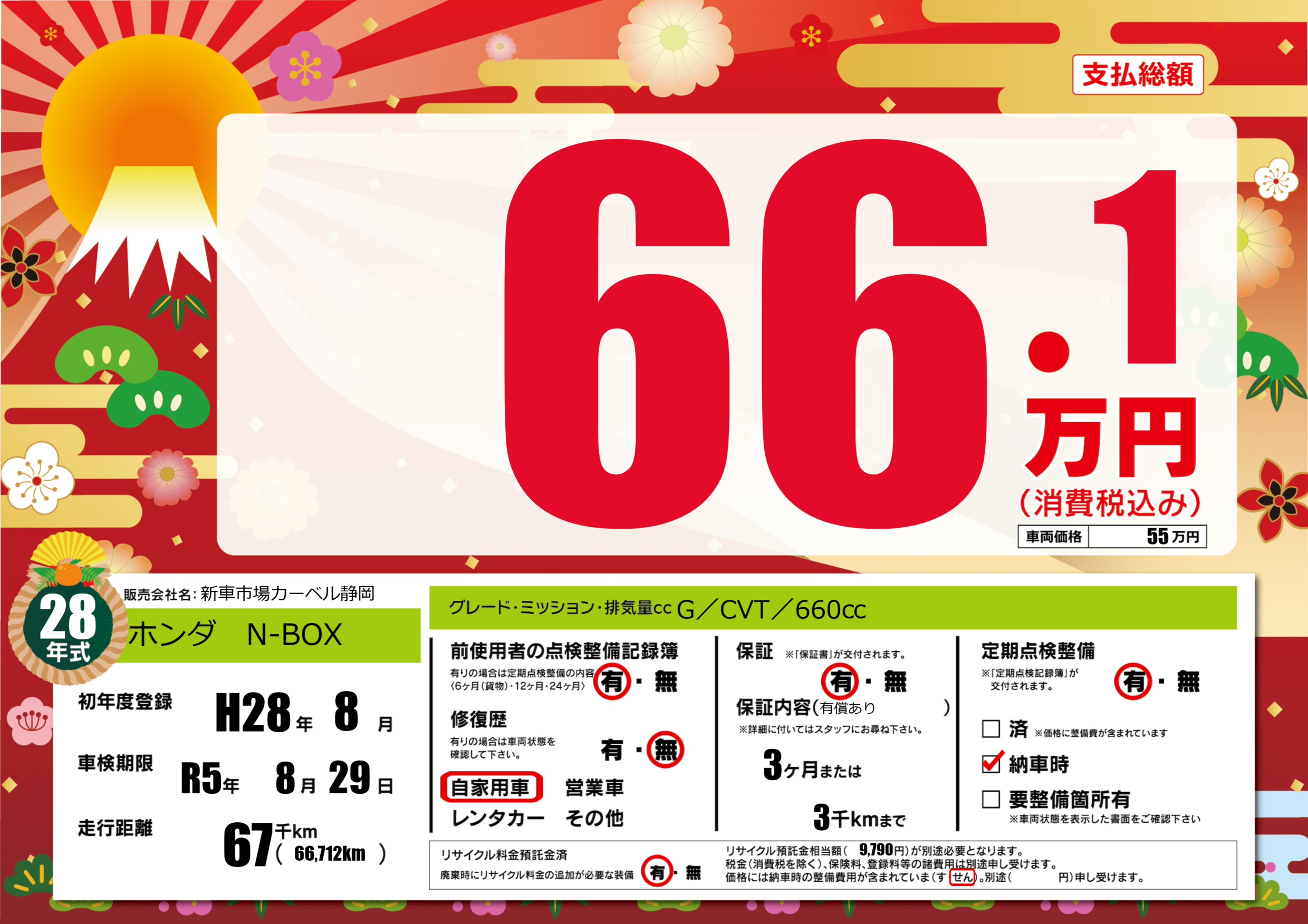 | 車名 | ホンダ N-BOX | グレード ミッション 排気量 |