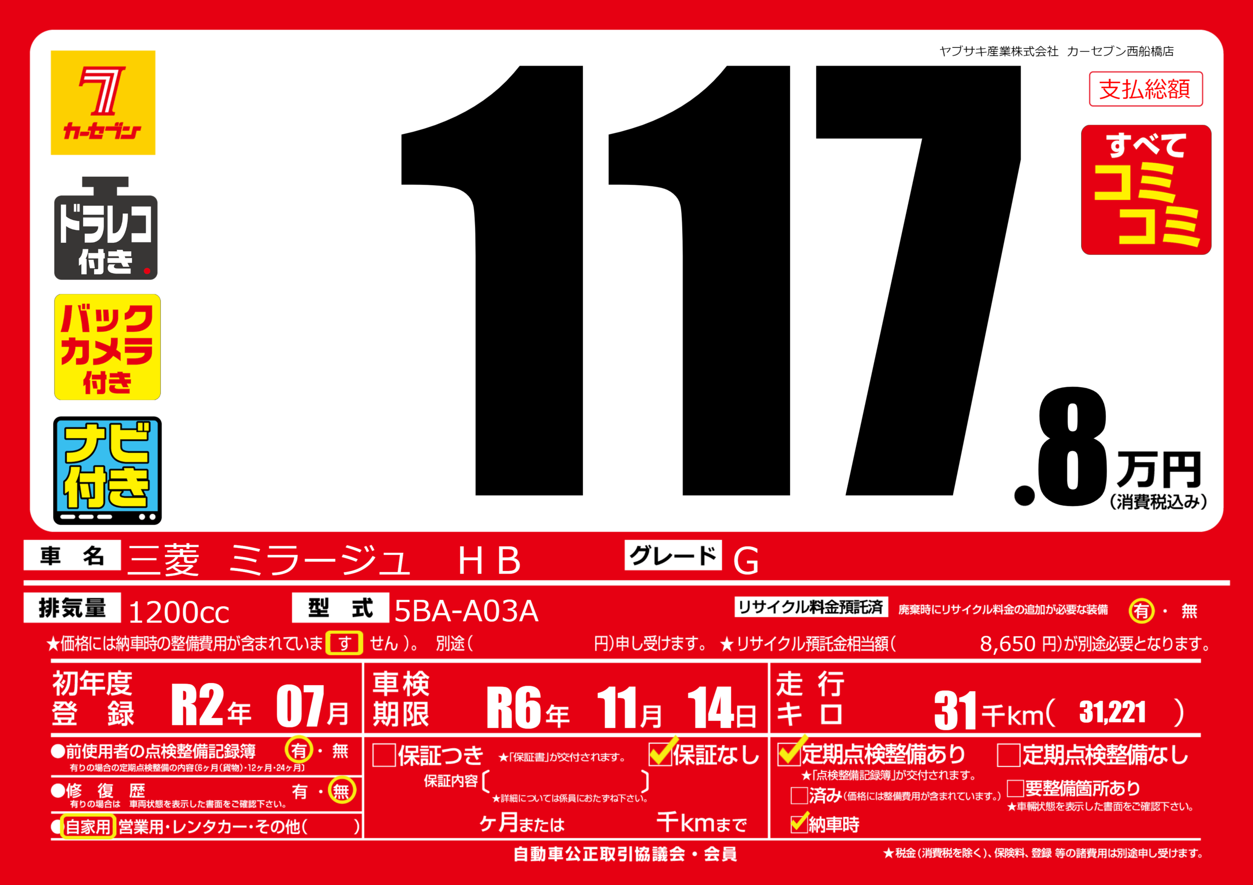 | 走行キロ | 3.1万km | 初年度登録 | R2年07月 |