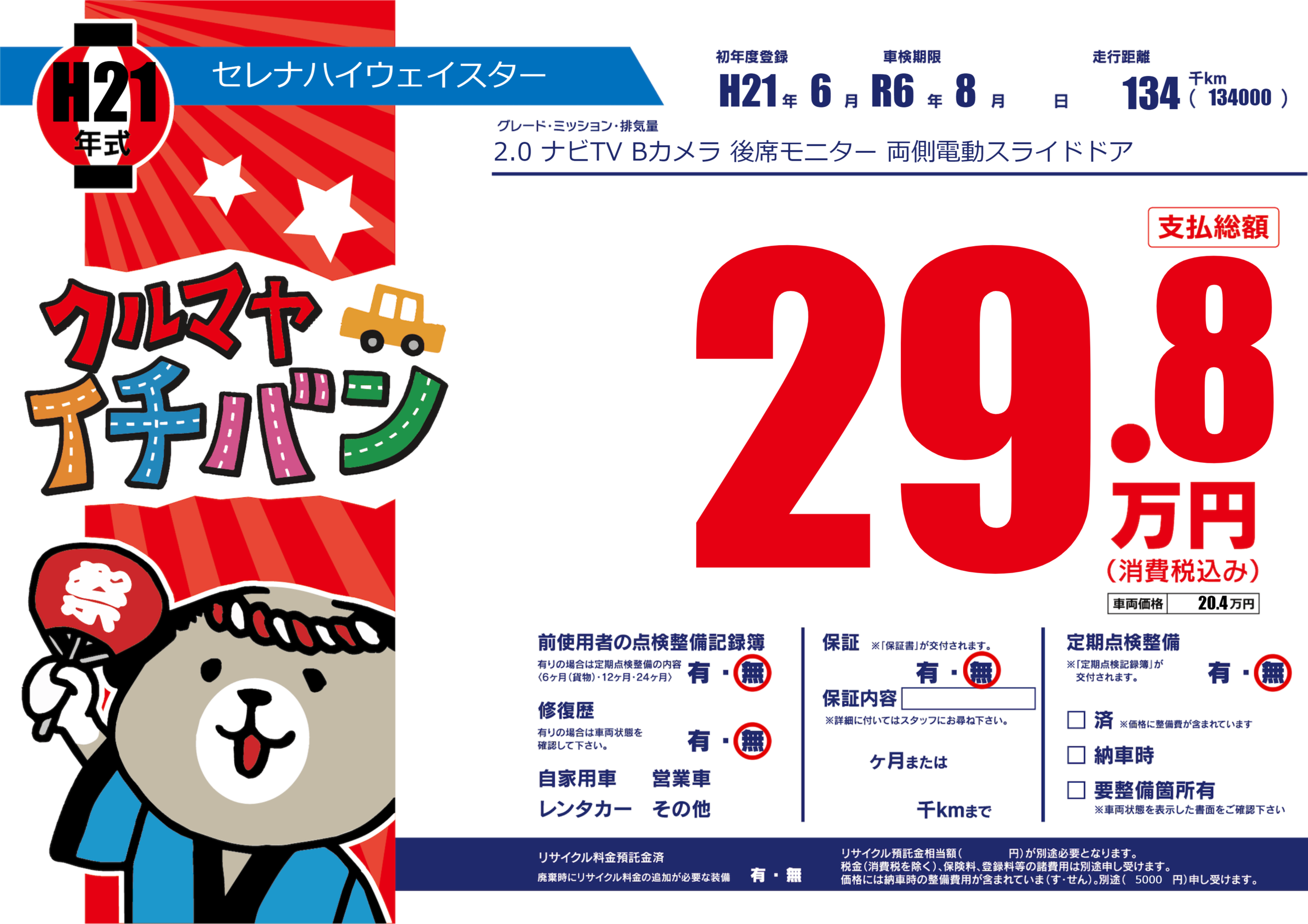 | 走行キロ | 13.4万km | 初年度登録 | H21年6月 |