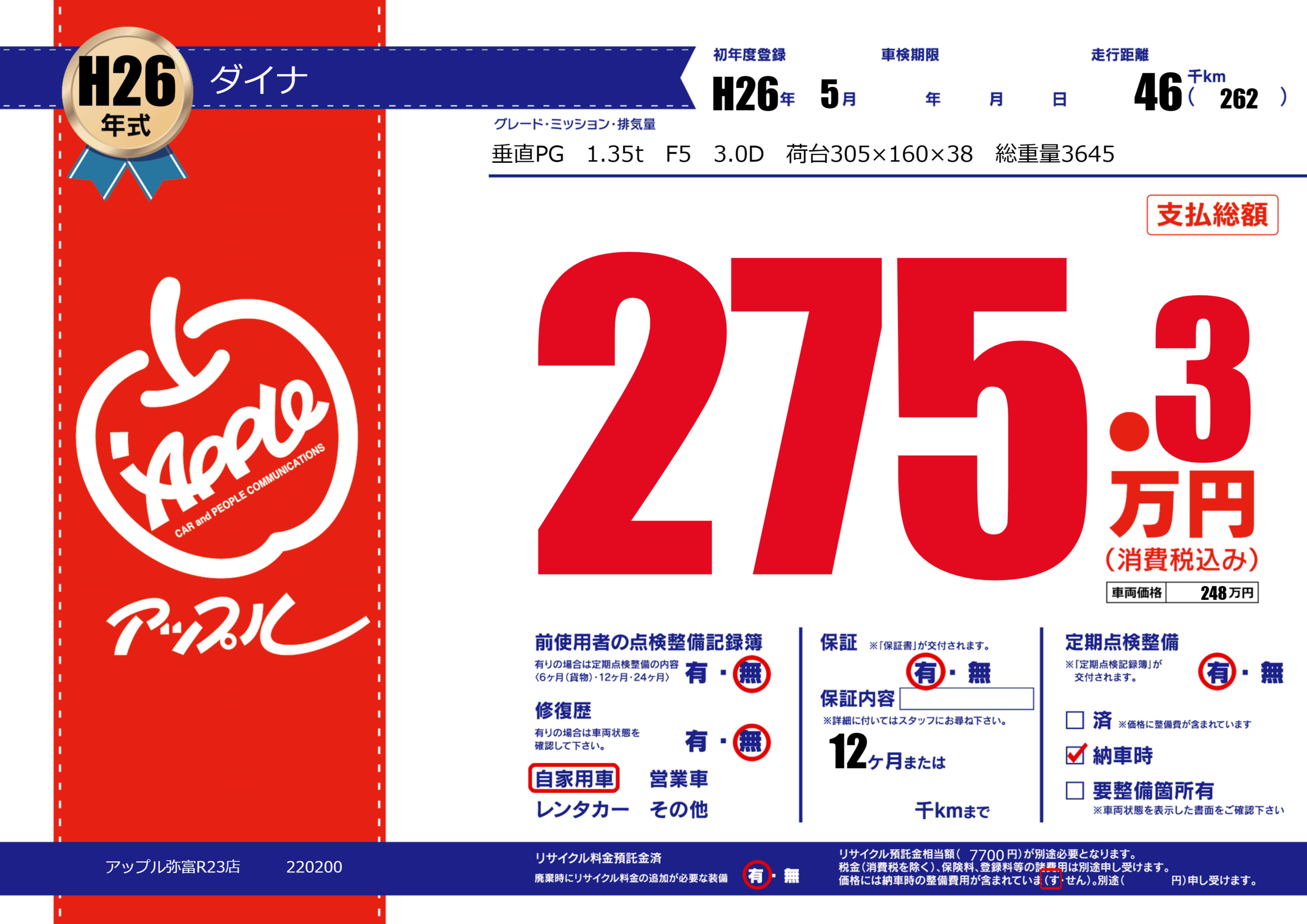 | 車名 | ダイナ | グレード ミッション 排気量 |