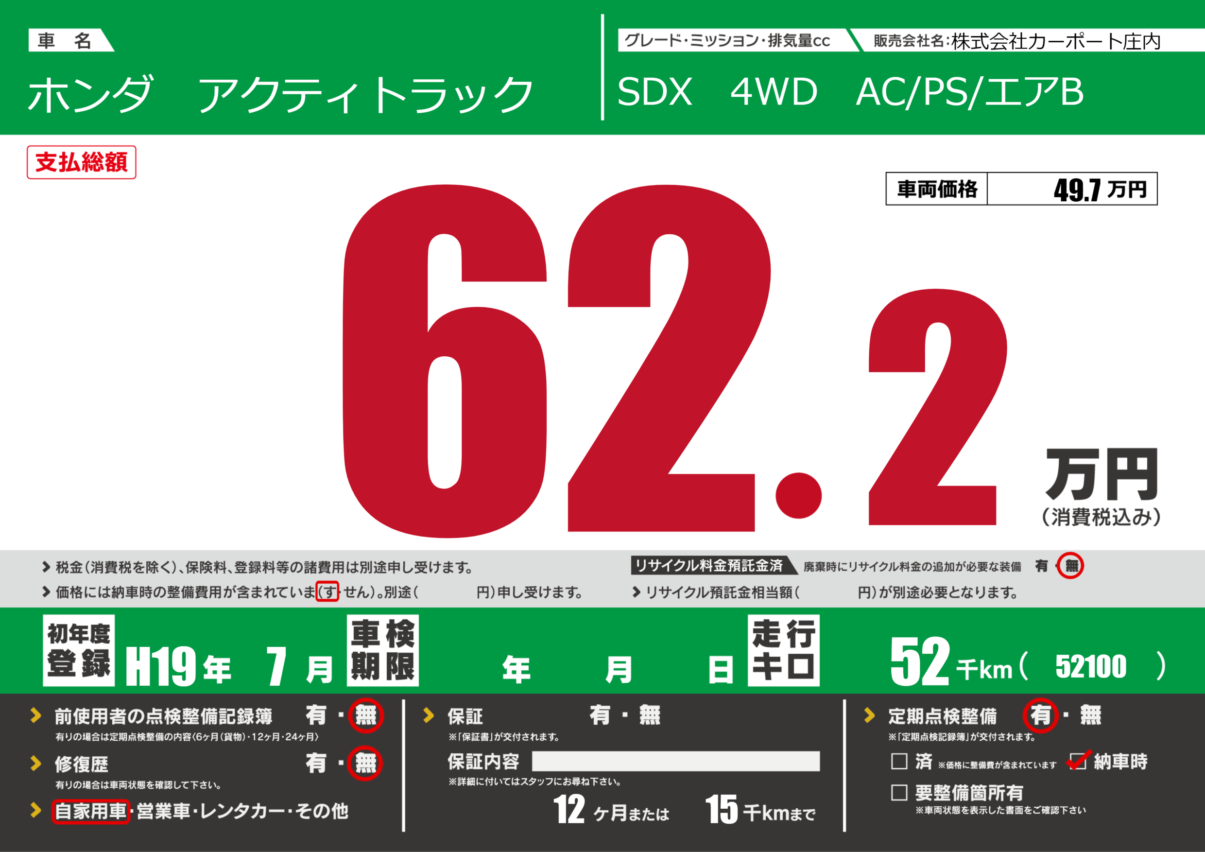 | 定期点検整備 | 定期点検整備あり 納車時あり | ||