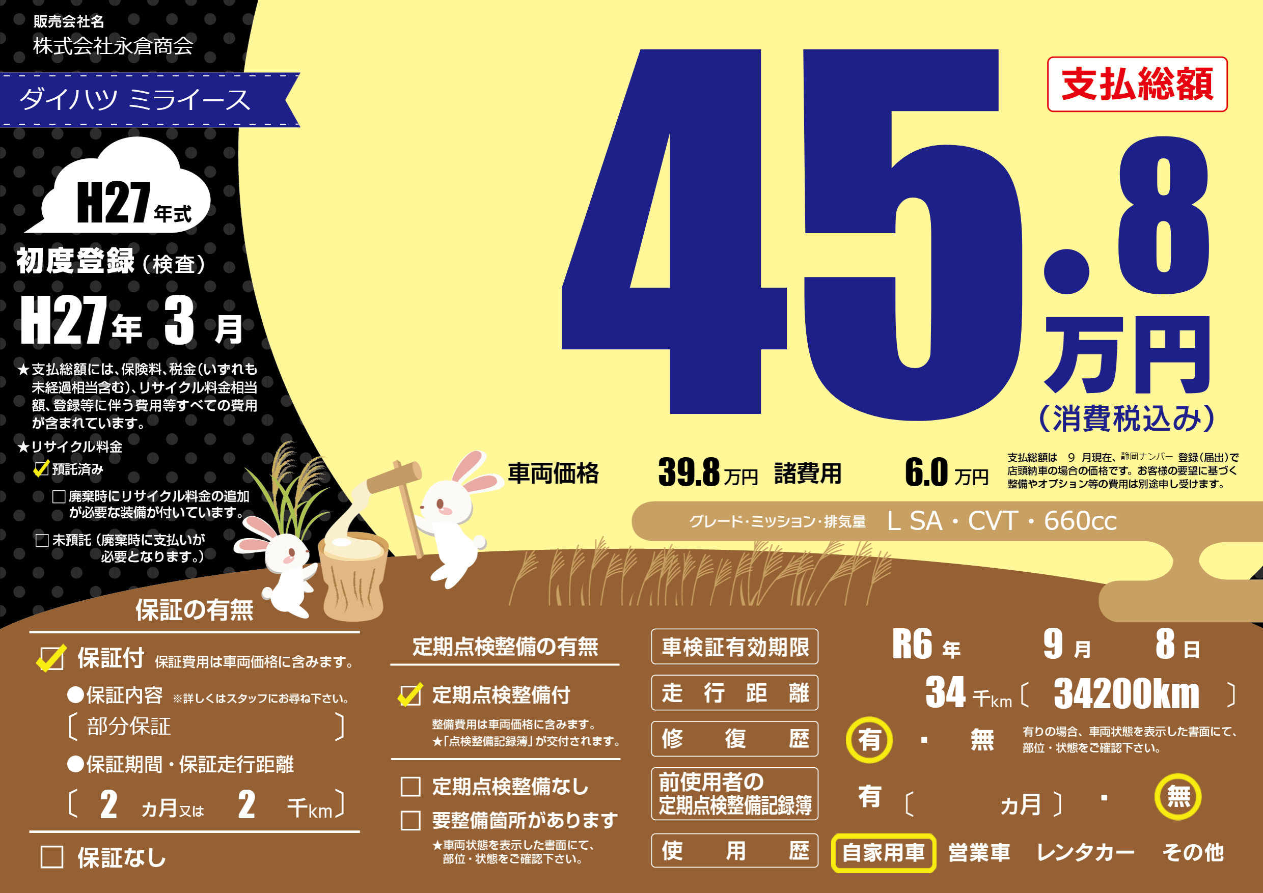 | 走行キロ | 3.4万km | 初年度登録 | H27年3月 |