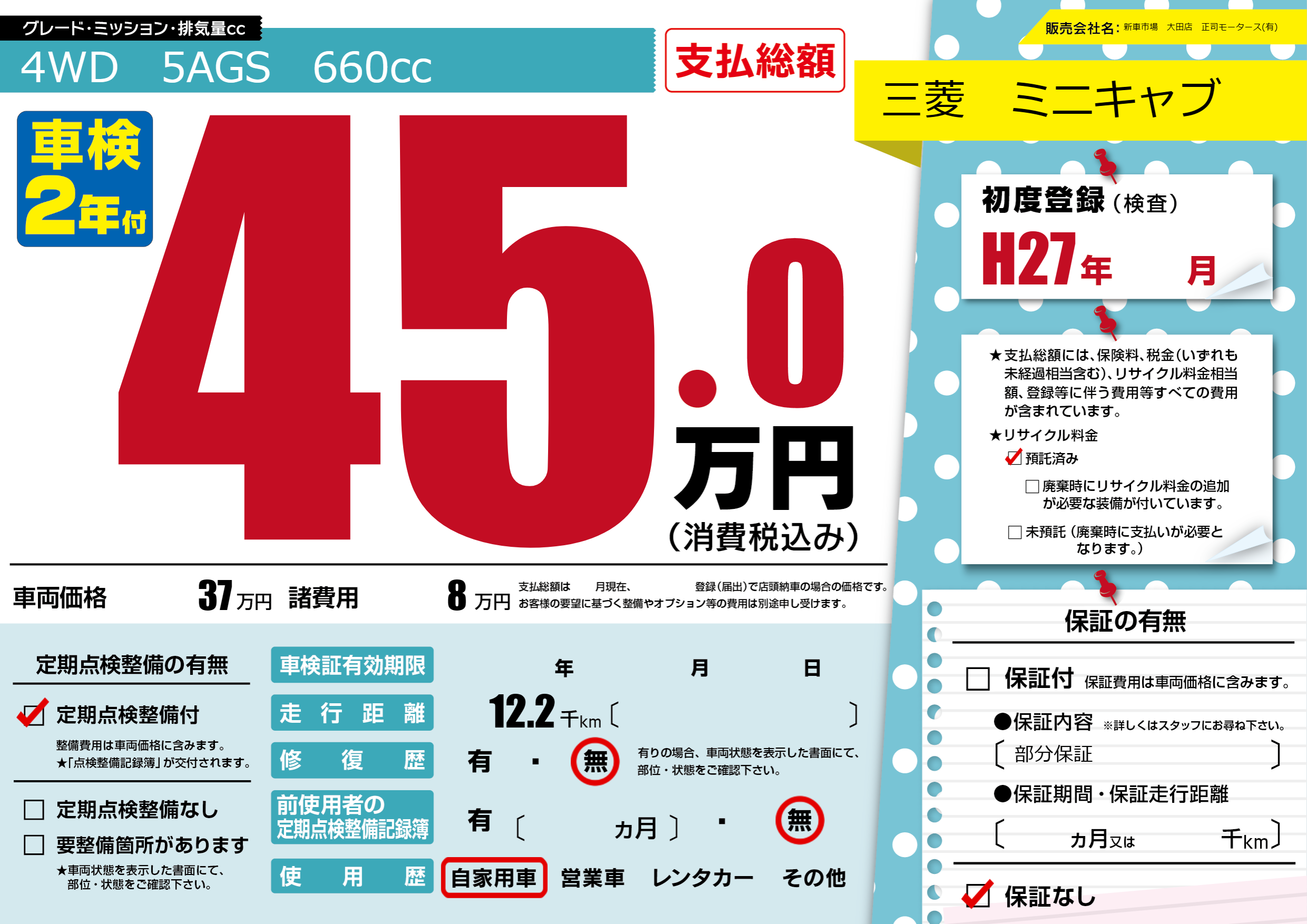 保証なし 保証内容(部分保証) ---ヶ月または()千kmまで |