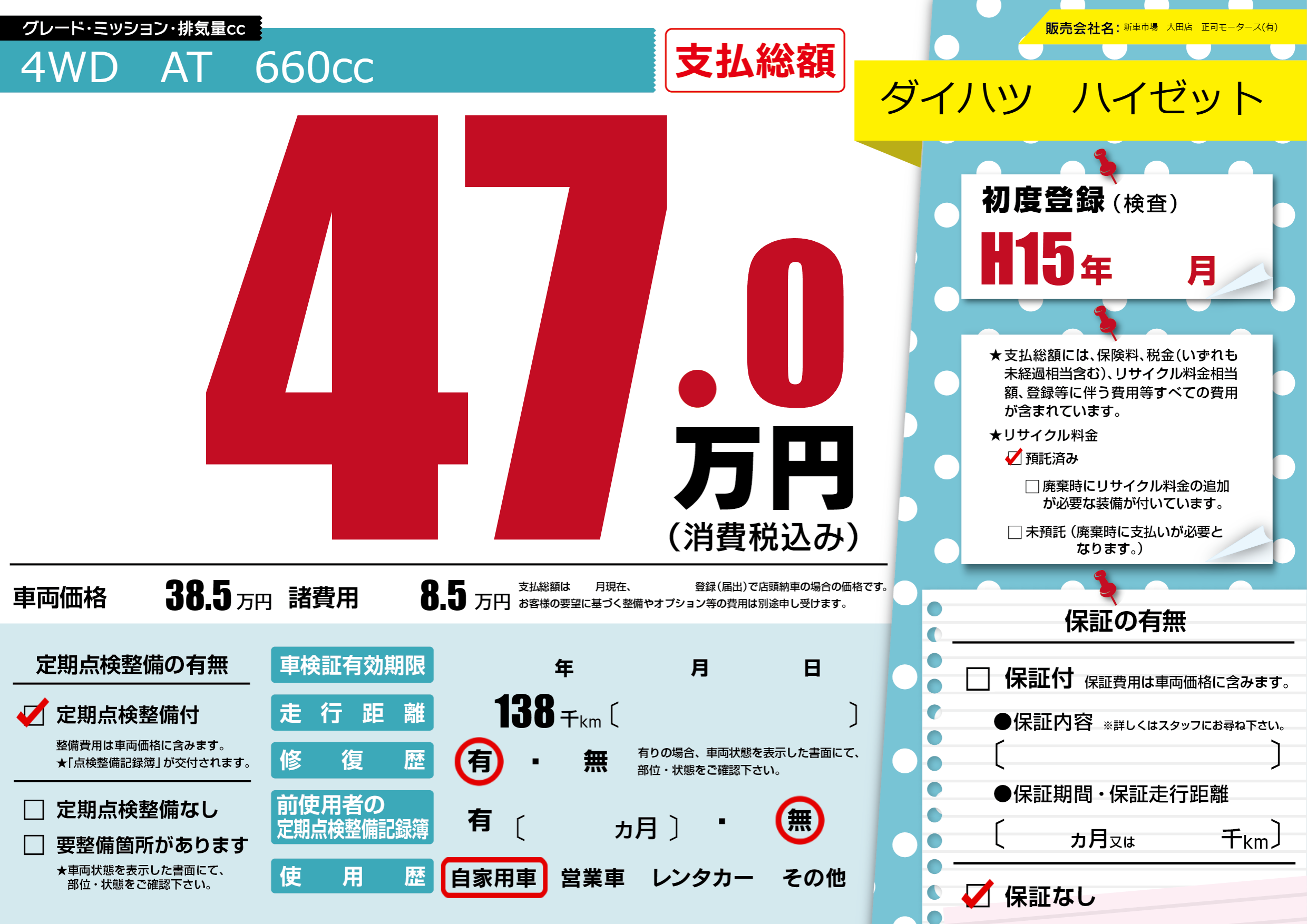 | 車名 | ダイハツ ハイゼット | グレード ミッション 排気量 |
