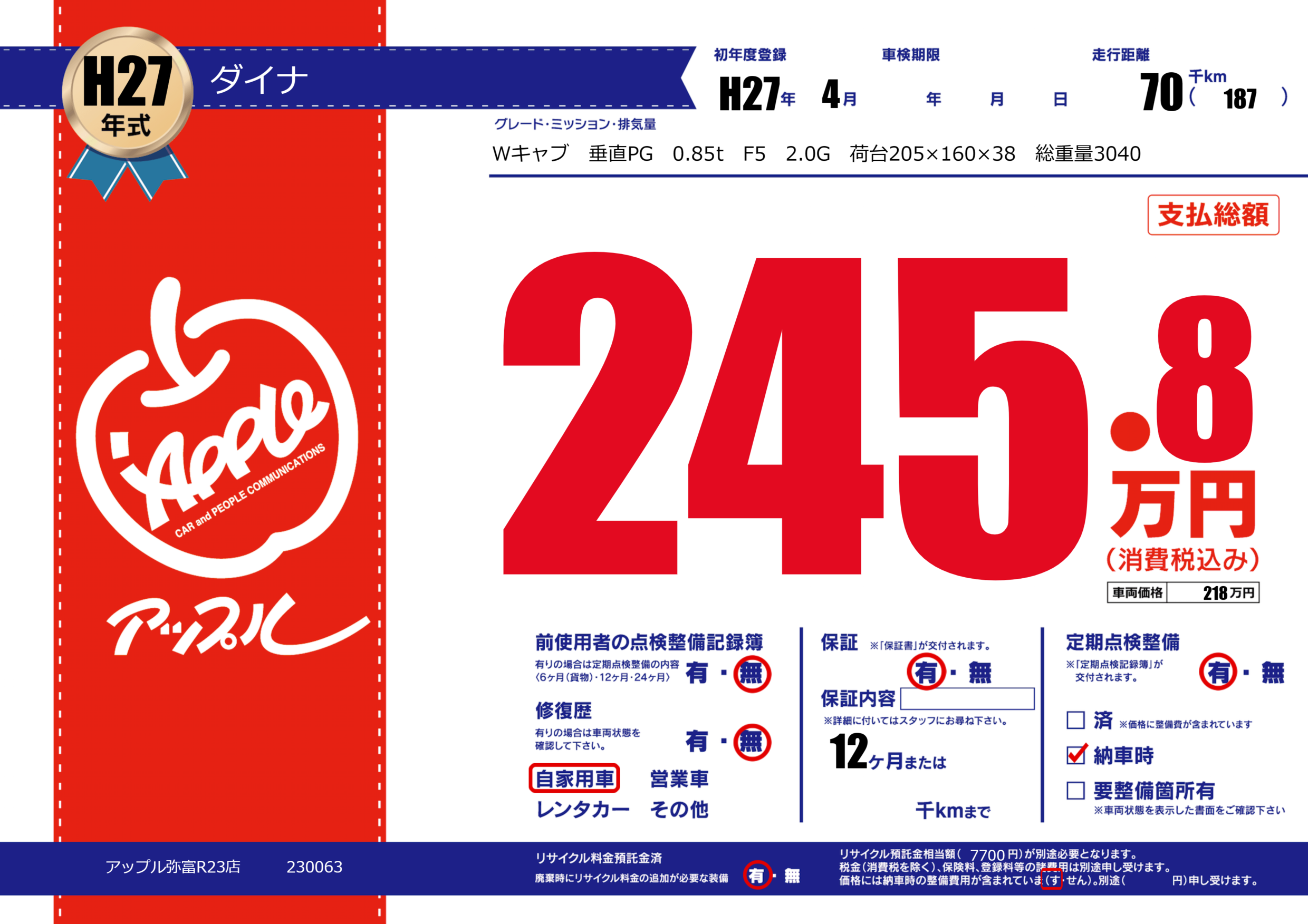 | 車名 | ダイナ | グレード ミッション 排気量 |