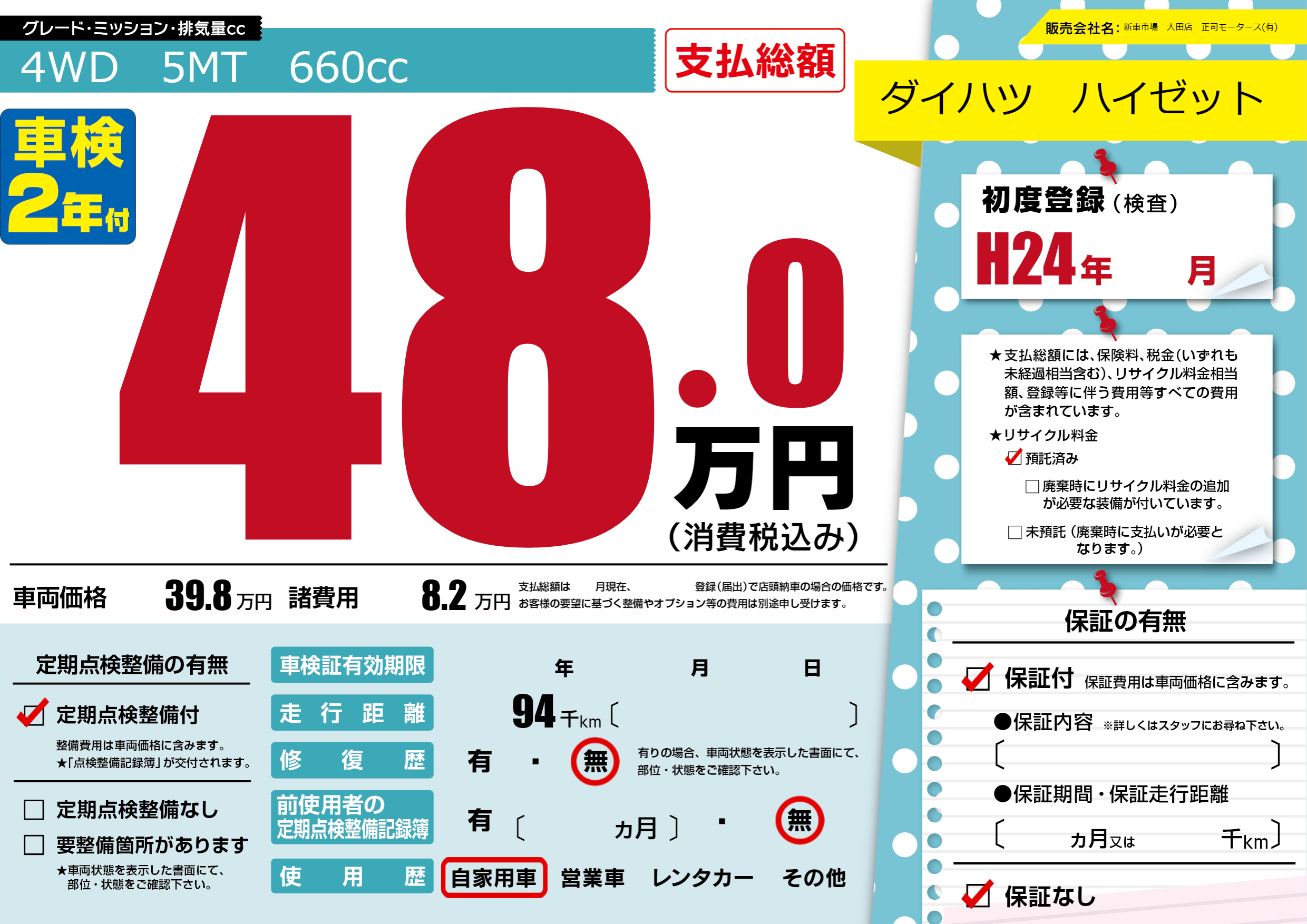 | 車名 | ダイハツ ハイゼット | グレード ミッション 排気量 |